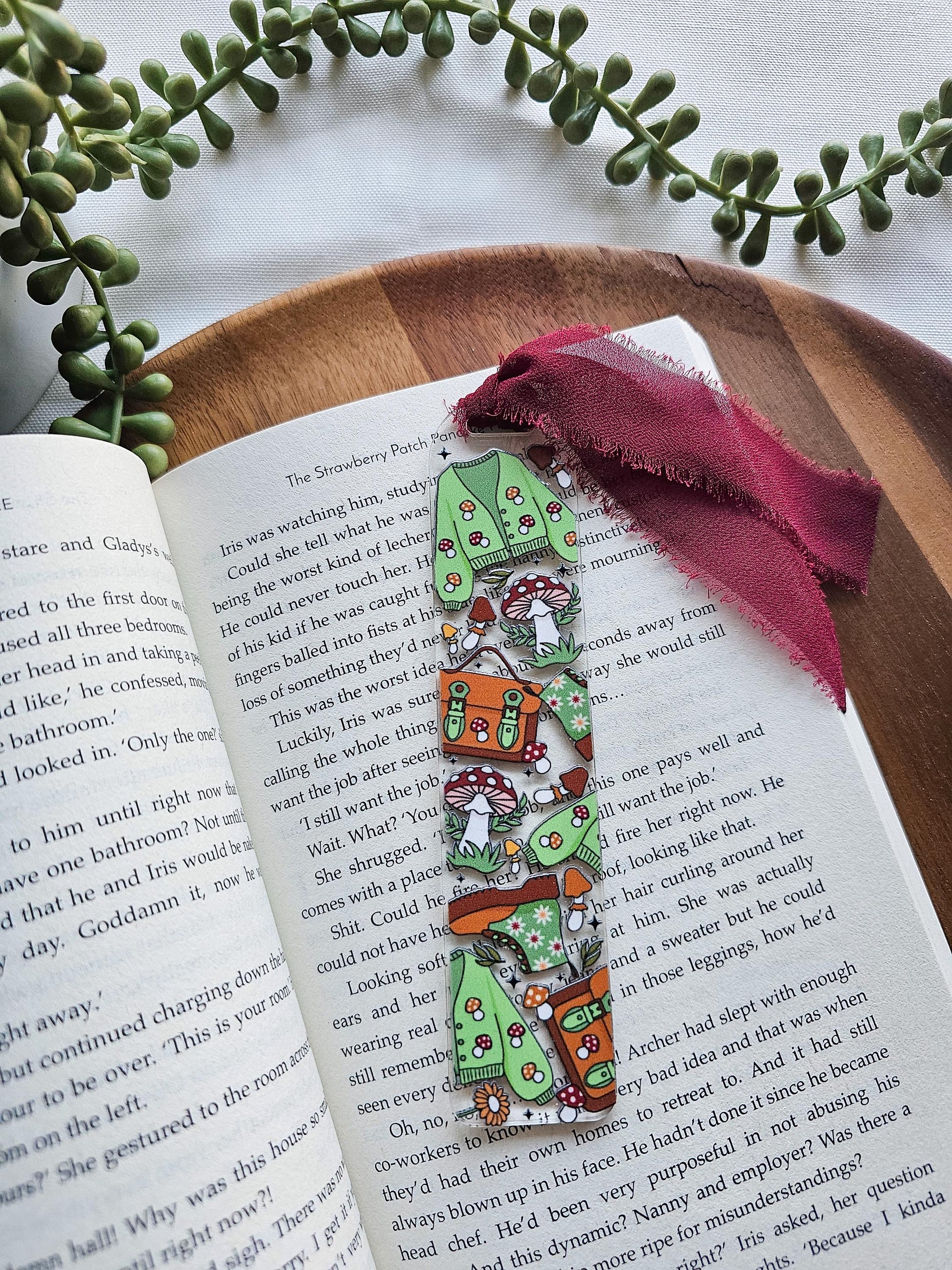 This particular bookmark features an adorable Autumn cottage core themed decal and a matching maroon chiffon ribbon tassel.