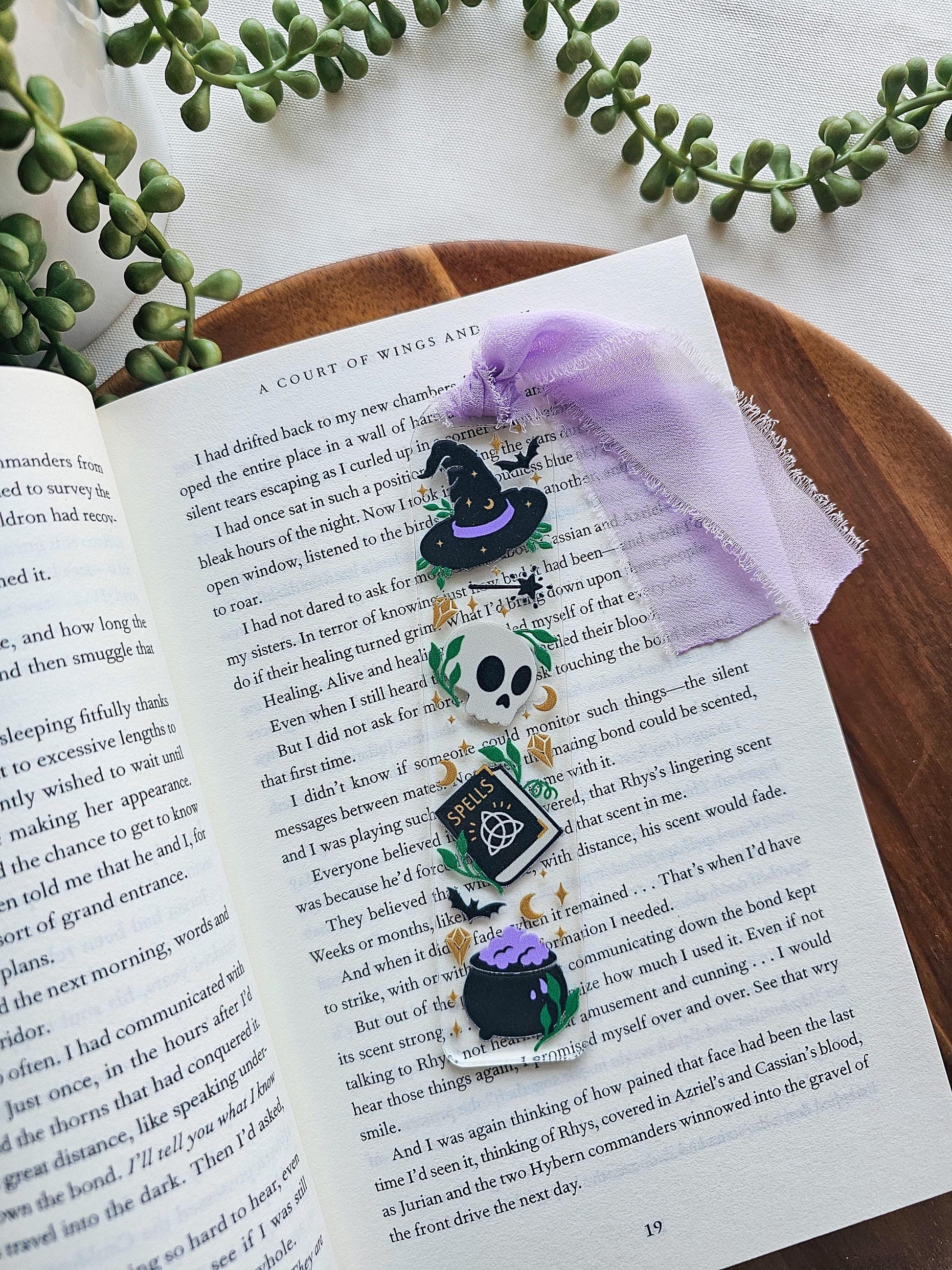 This particular bookmark features an adorable spooky themed decal with all of the witchy vibes and a matching purple chiffon ribbon tassel.