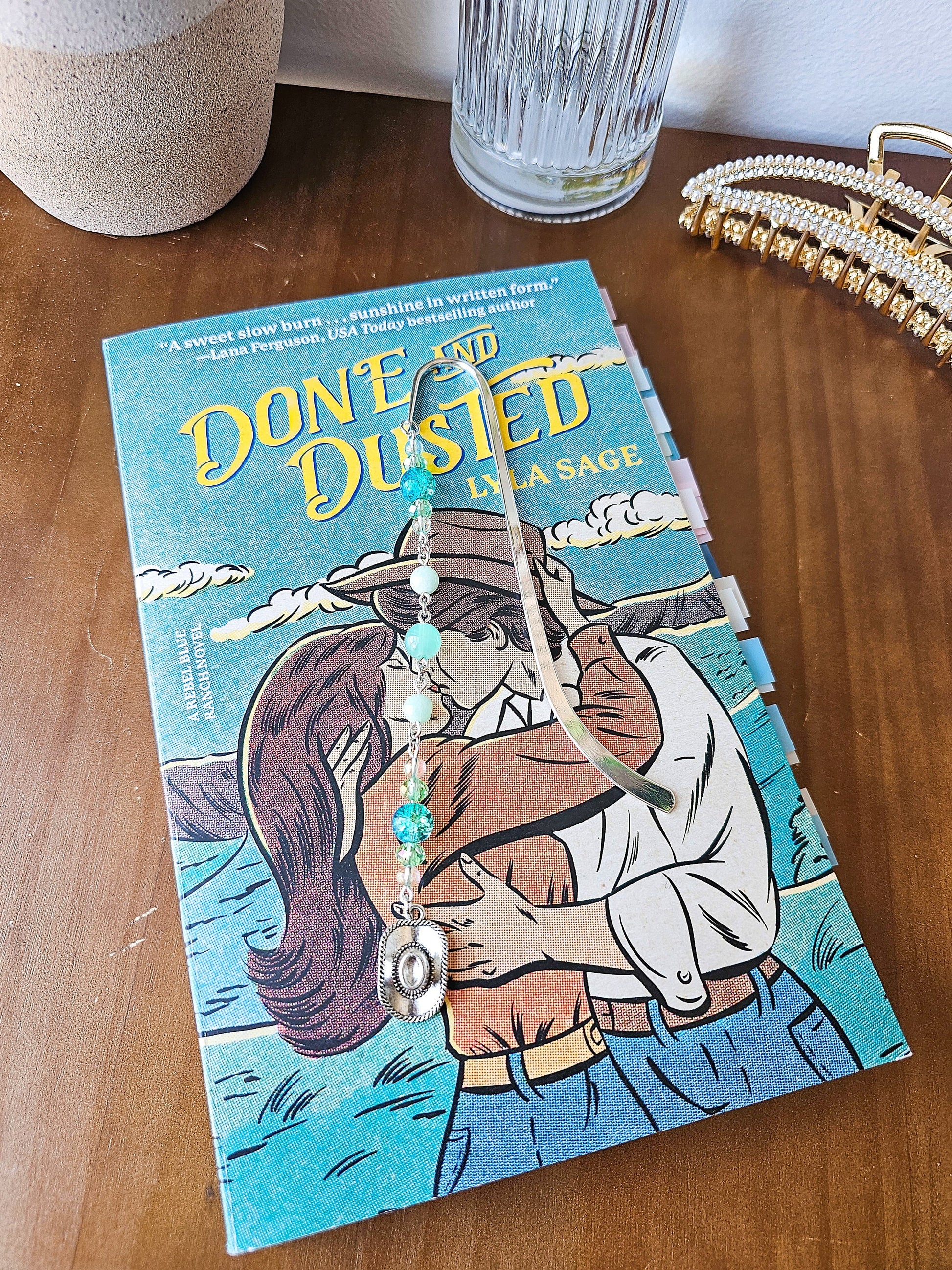 Featuring a silver cowboy hat charm paired with soft blue crystal accents, this piece adds a subtle western touch to your reading routine. Simple yet intentional, it's perfect for marking your place or styling on a bookshelf alongside your favorite romances.