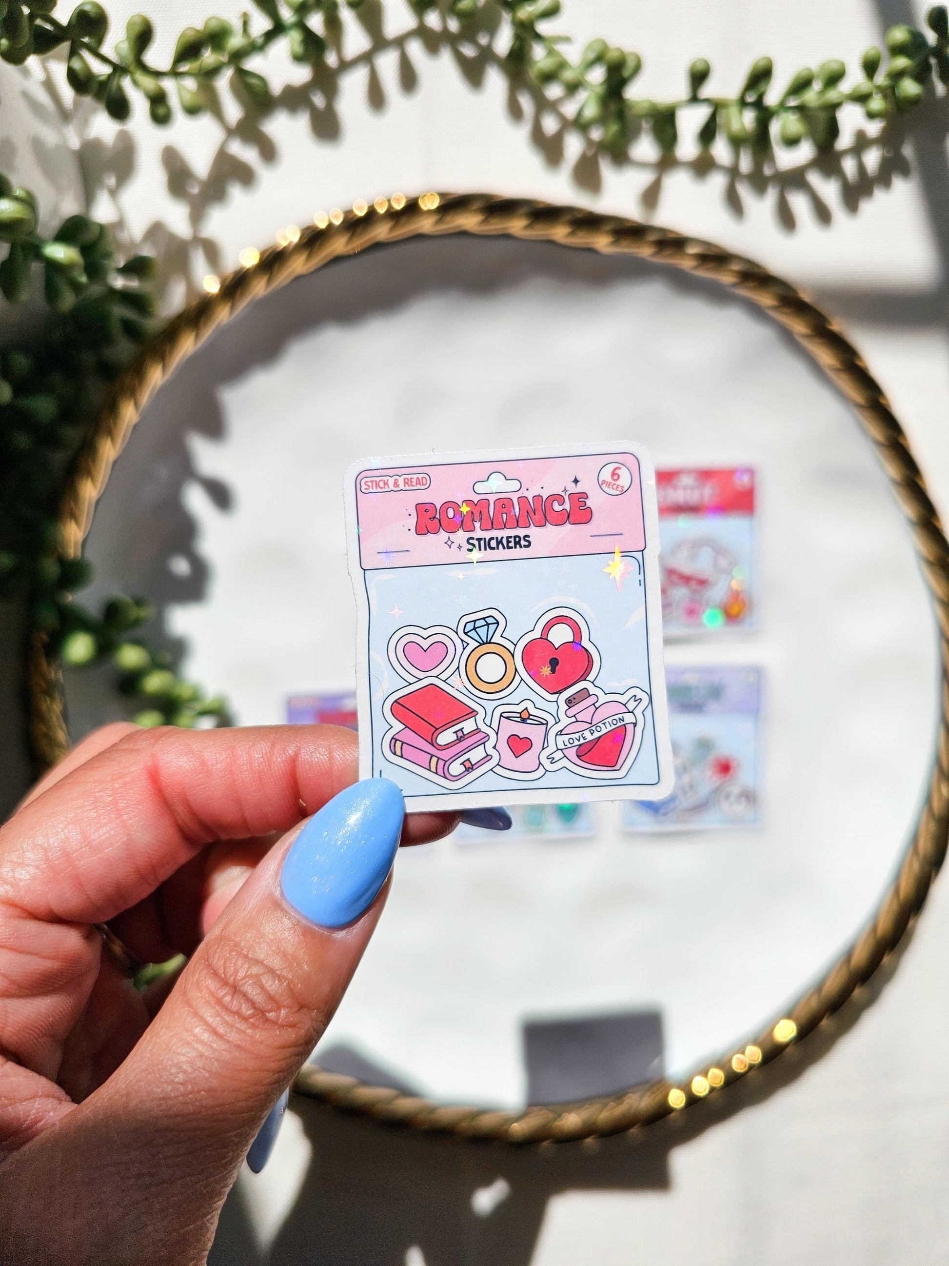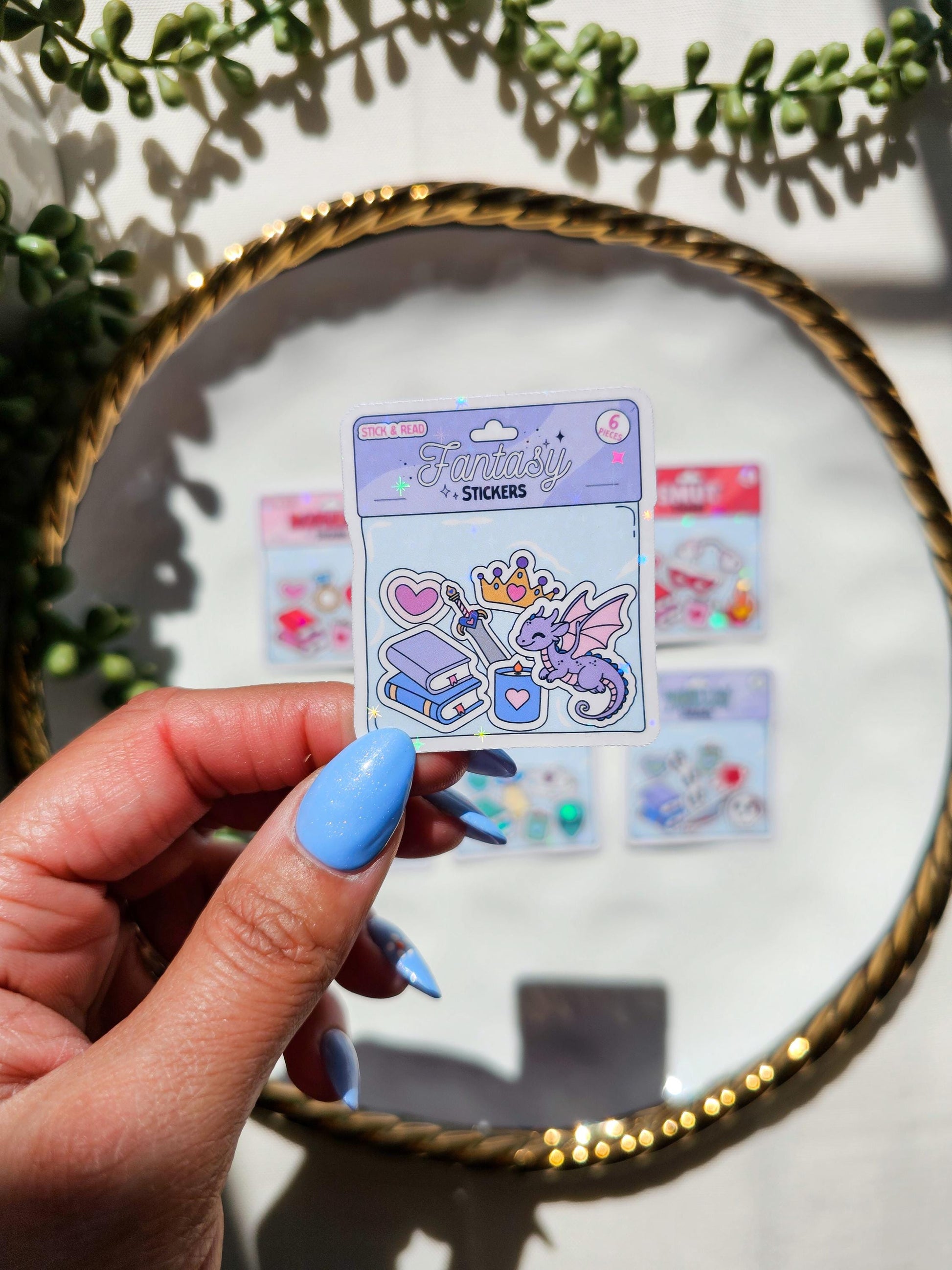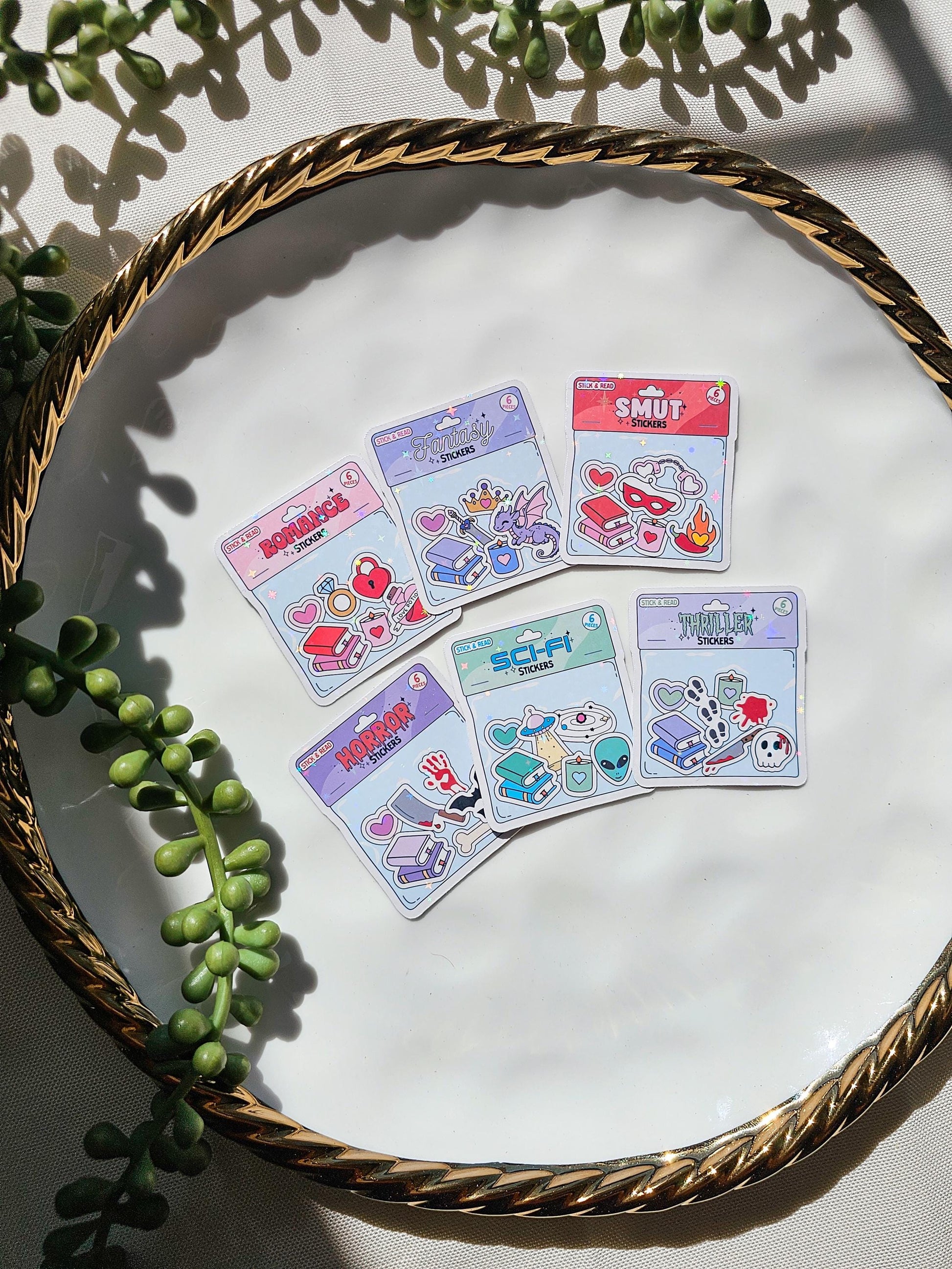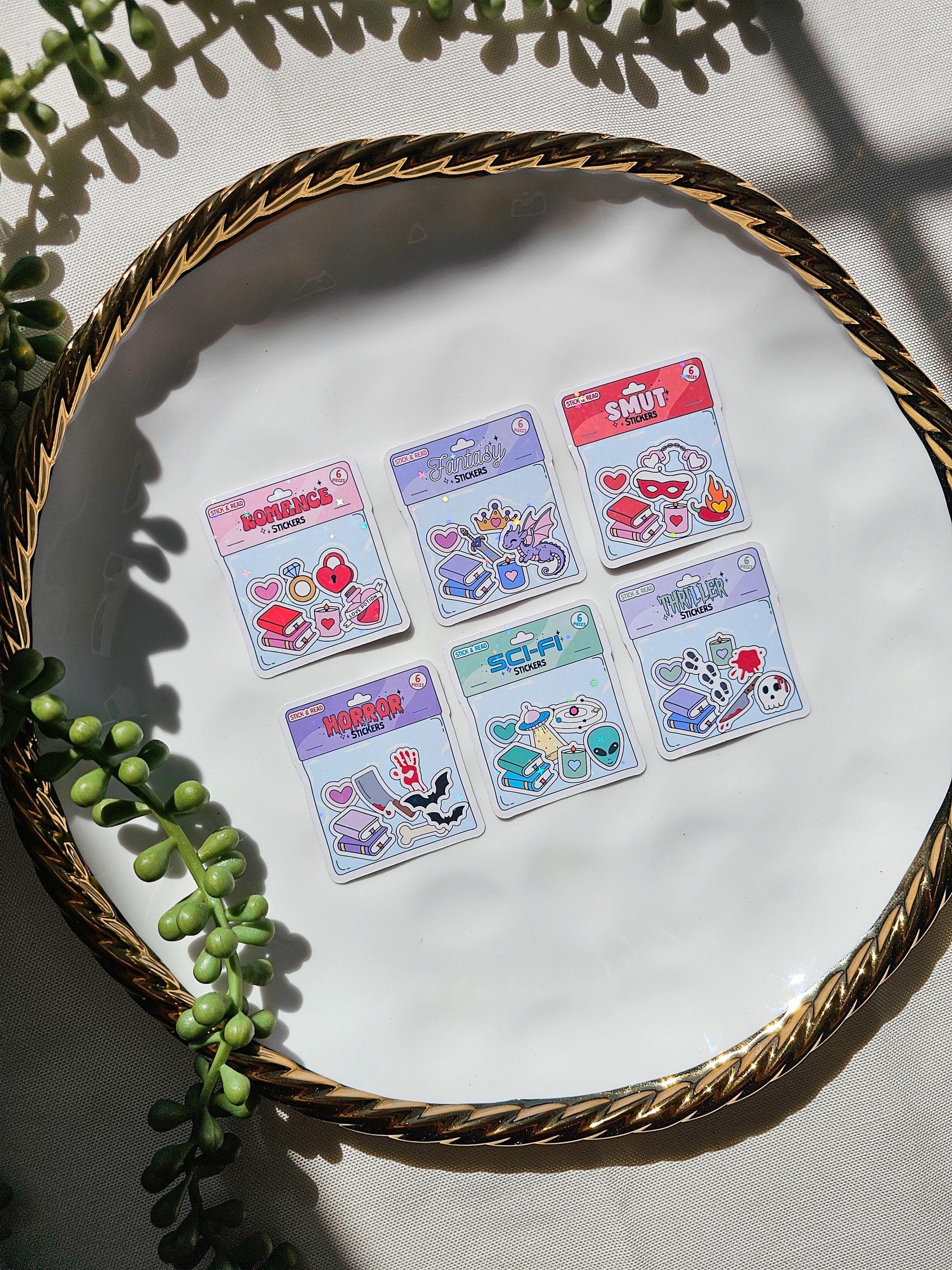 Each design features a stack of genre-inspired mini stickers, carefully illustrated to capture the vibe of your most-loved reads. Whether you're deep in romance, lost in fantasy worlds, or craving a little suspense, there's a genre to match your reading mood.