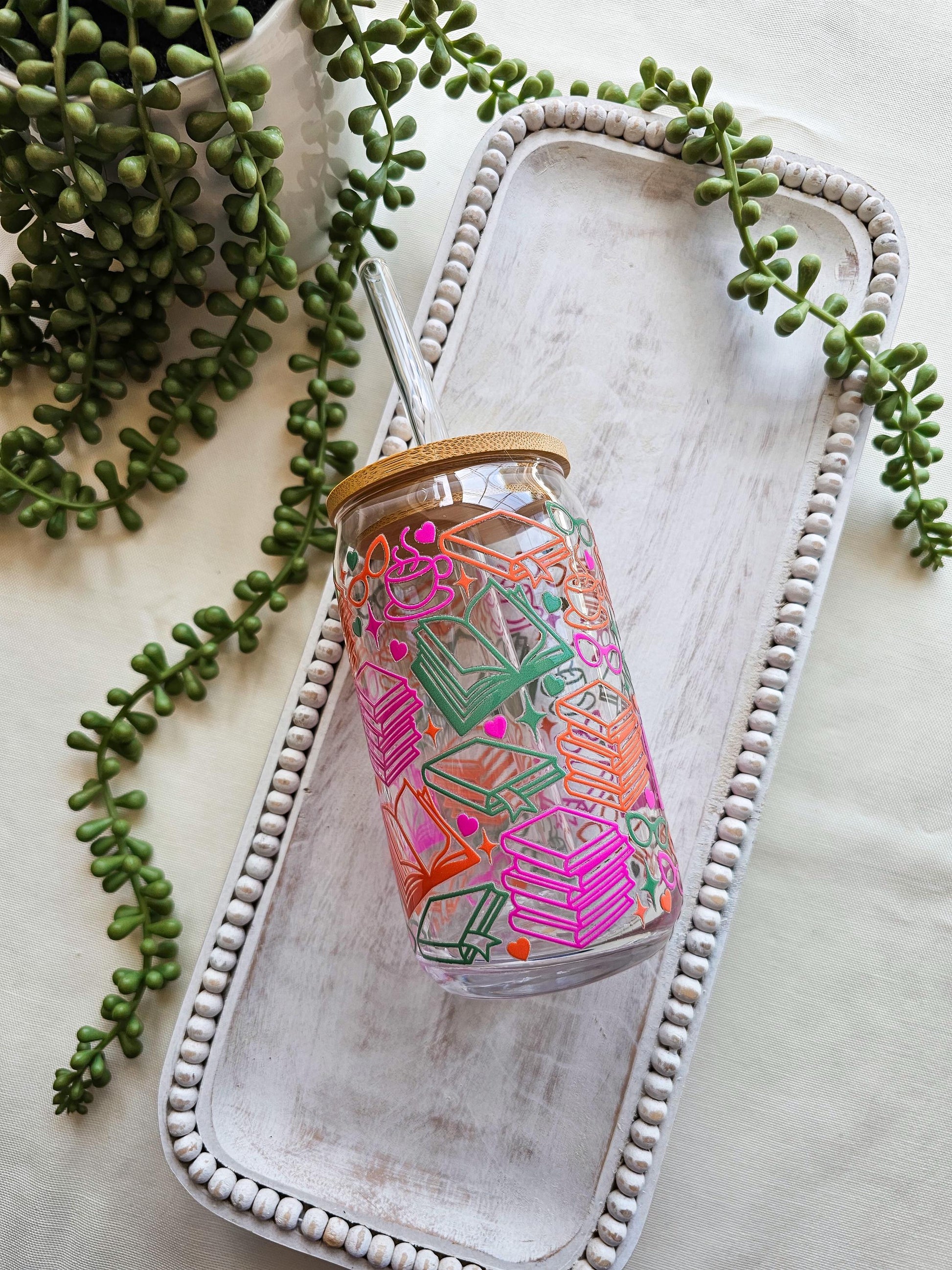 This 16 Fl oz cup features a charming bookworm design. Every purchase includes the cup itself, a glass straw, and a bamboo lid.
