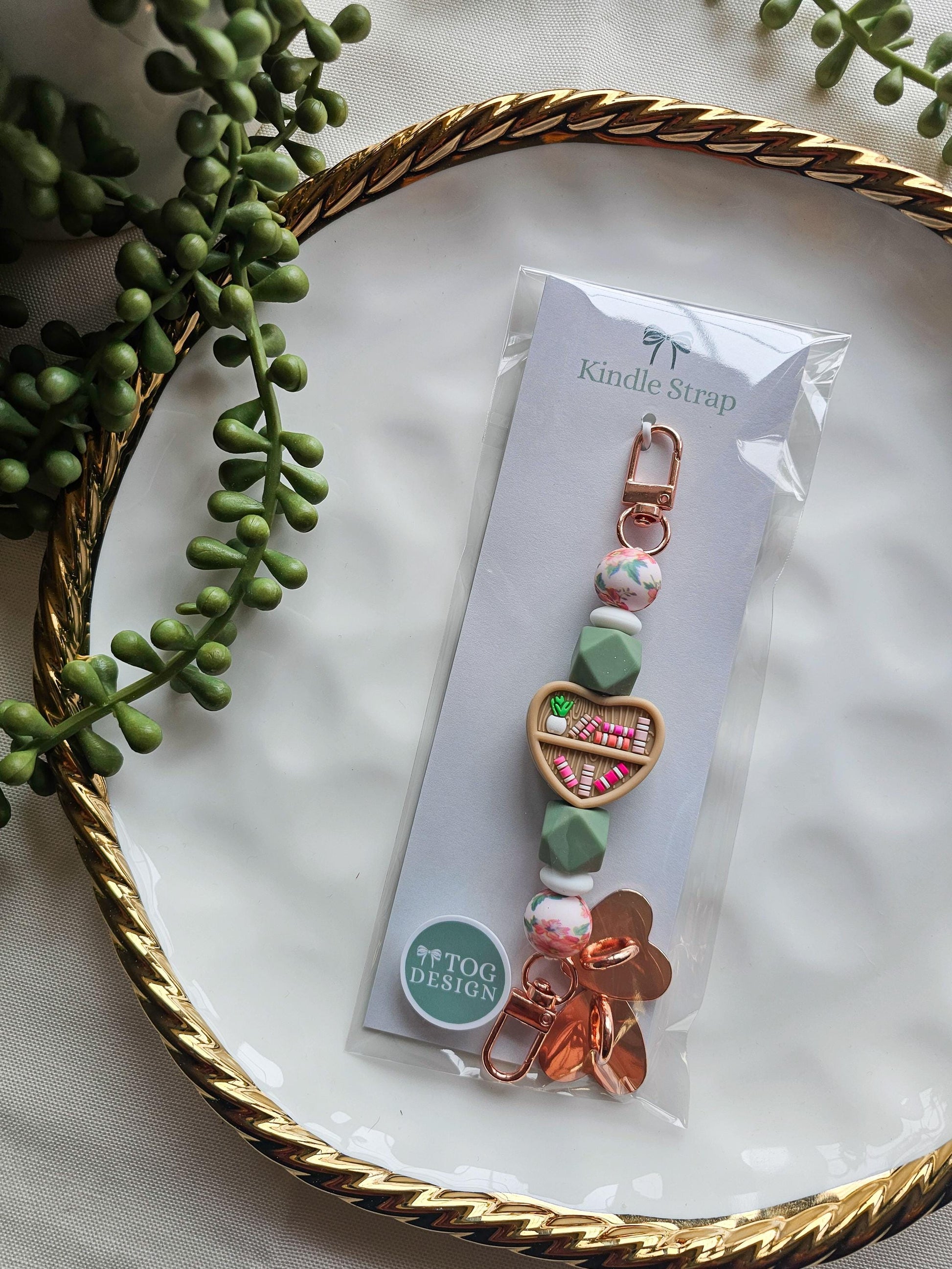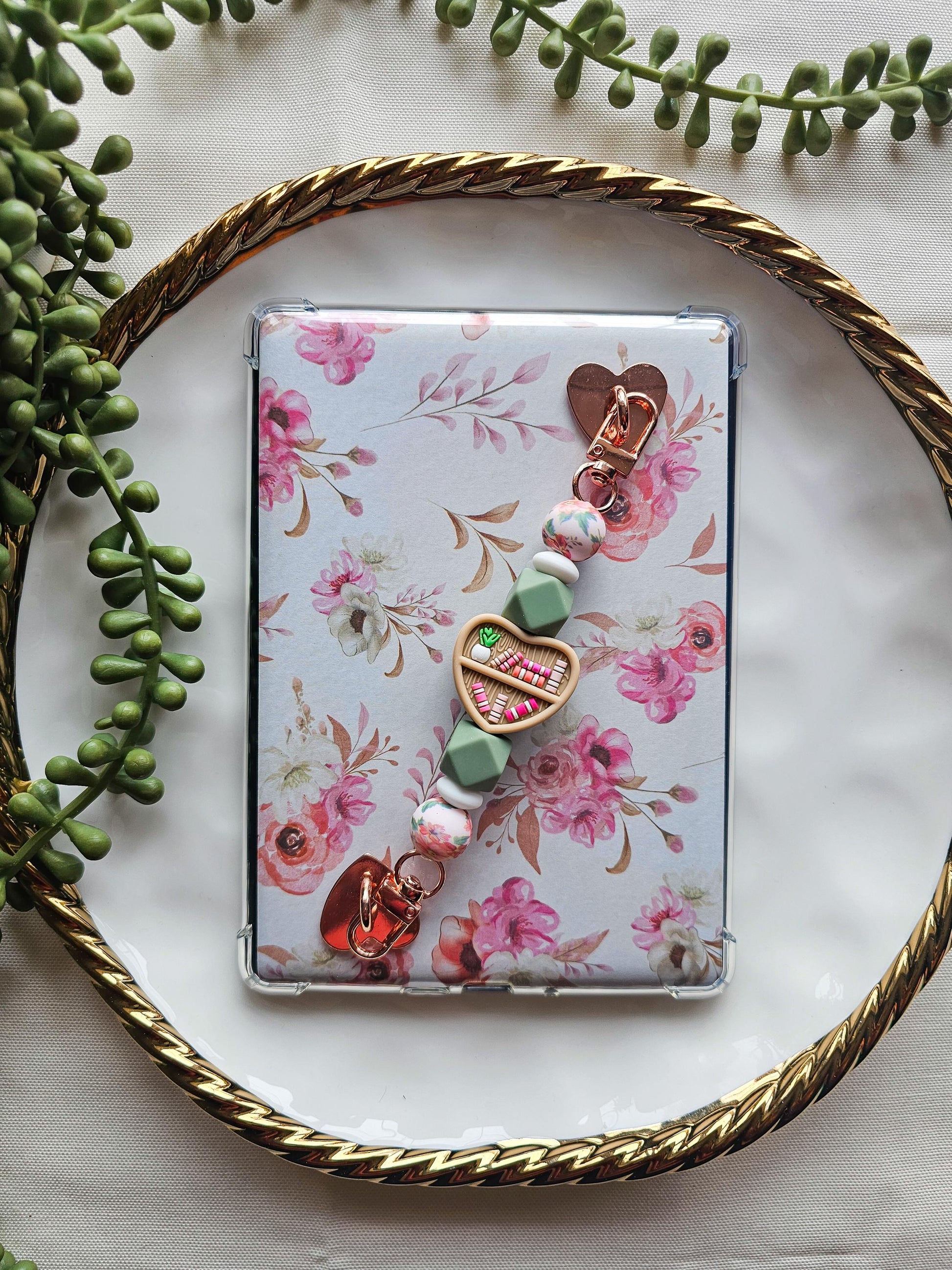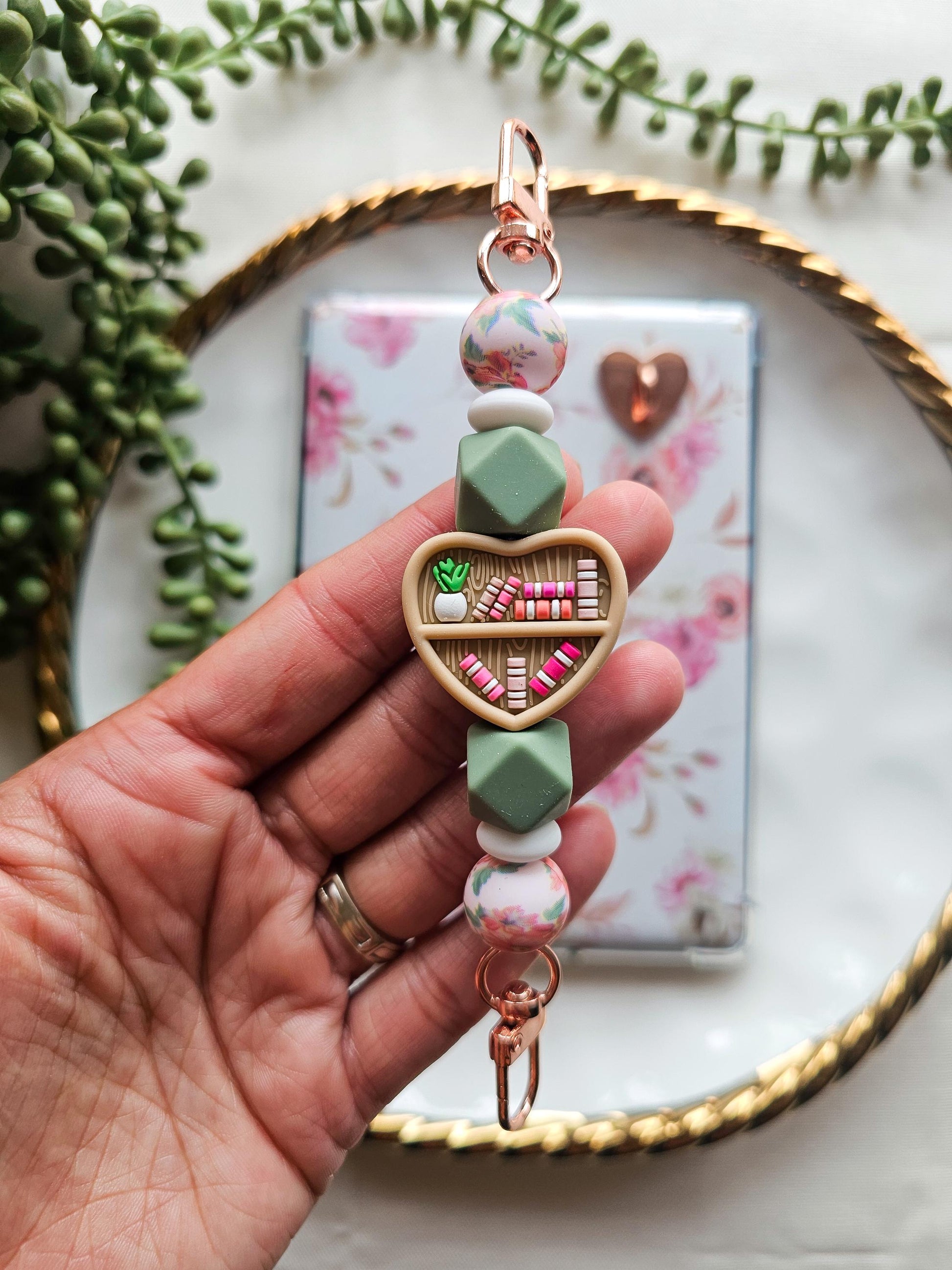 Featuring a heart-shaped bookshelf focal bead and soft sage and floral tones, this design is made for bookworms who embrace the joy of a never-ending reading list.