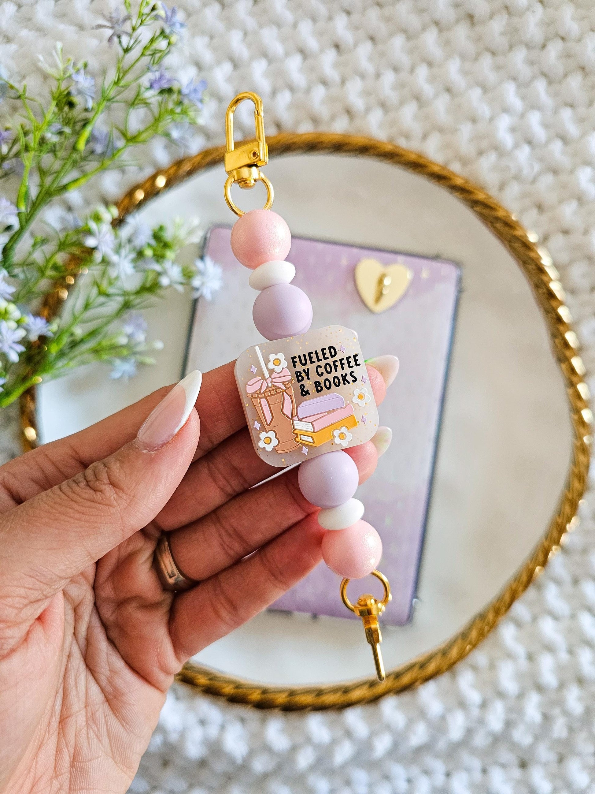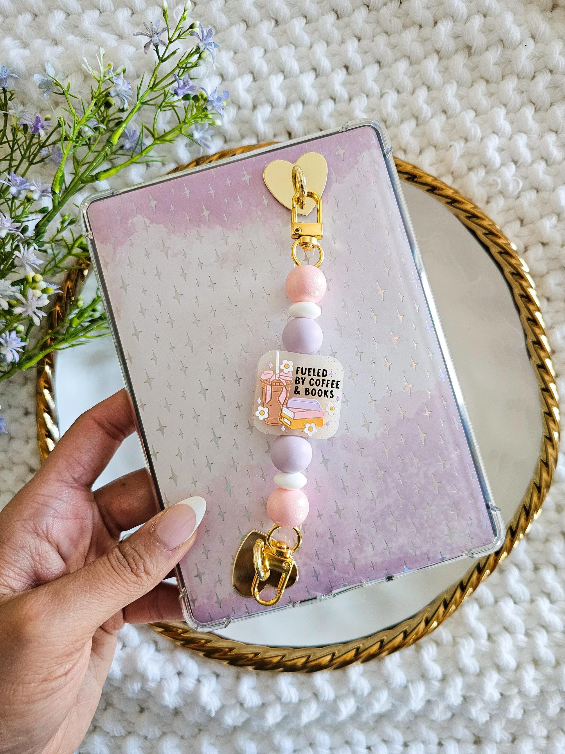 Featuring a charming focal bead with a stacked book and iced coffee design, paired with soft lilac and blush pink beads, this strap is a cozy essential for readers who believe the best days always include a coffee and a good book.