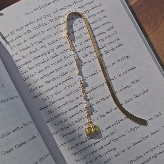 Featuring a delicate gold curb chain intertwined with iridescent crystal beads and a dainty book charm, this piece brings a soft elegance to your reading experience. Light-catching yet understated, it's designed to rest beautifully between pages or drape effortlessly over the spine of a book when not in use.