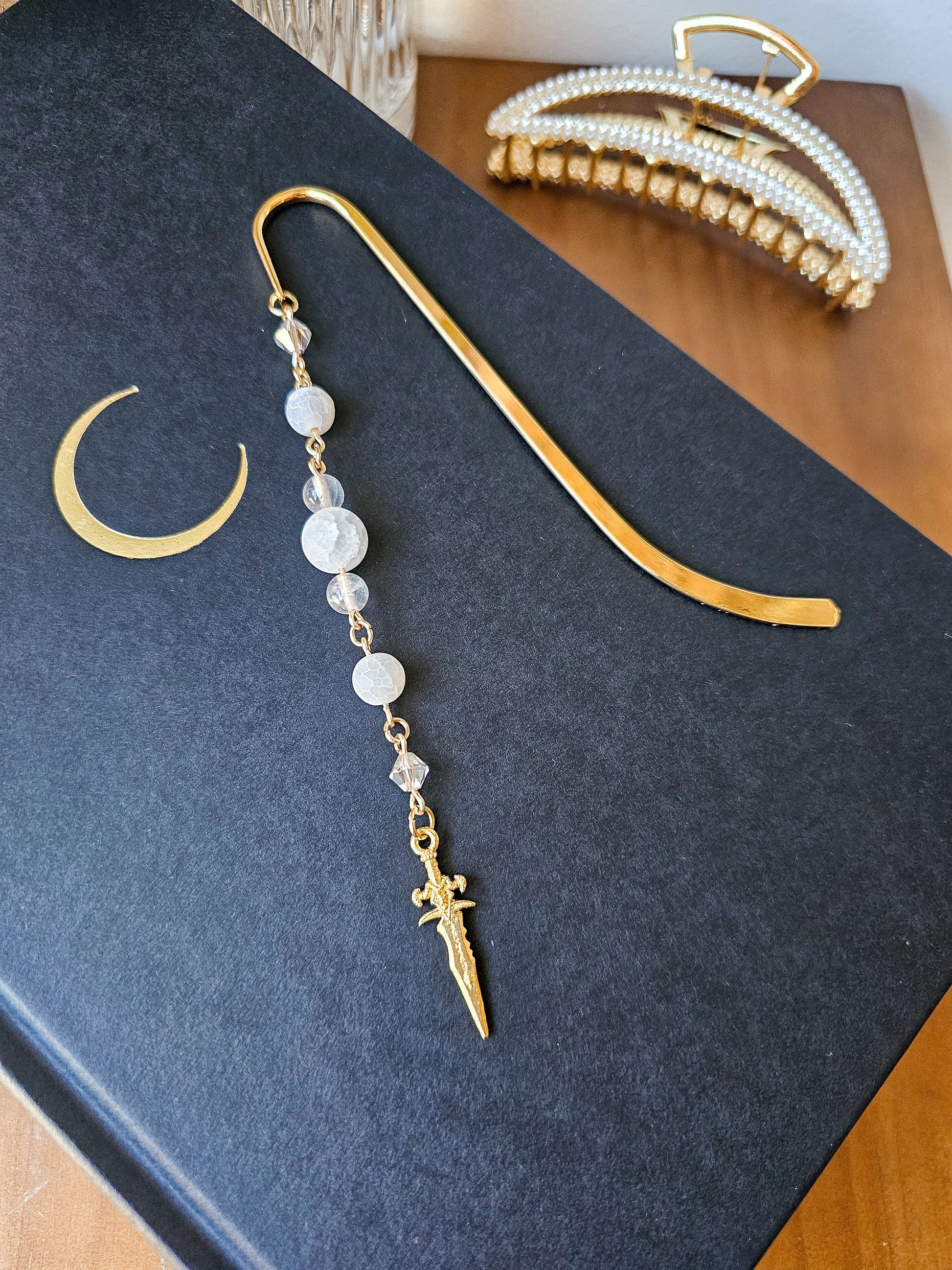 A crystal beaded metal hook bookmark with a dagger charm charm. This bookmark is the perfect match to your current Fantasy read!