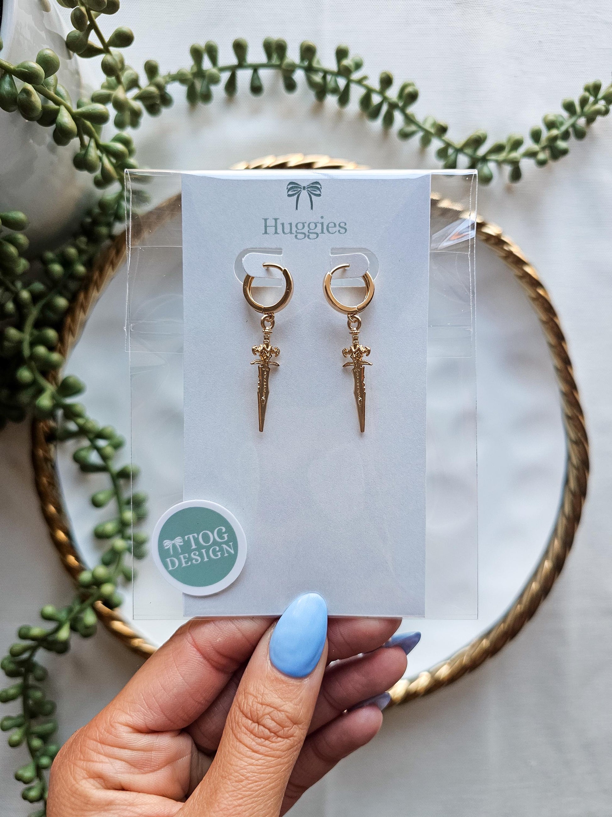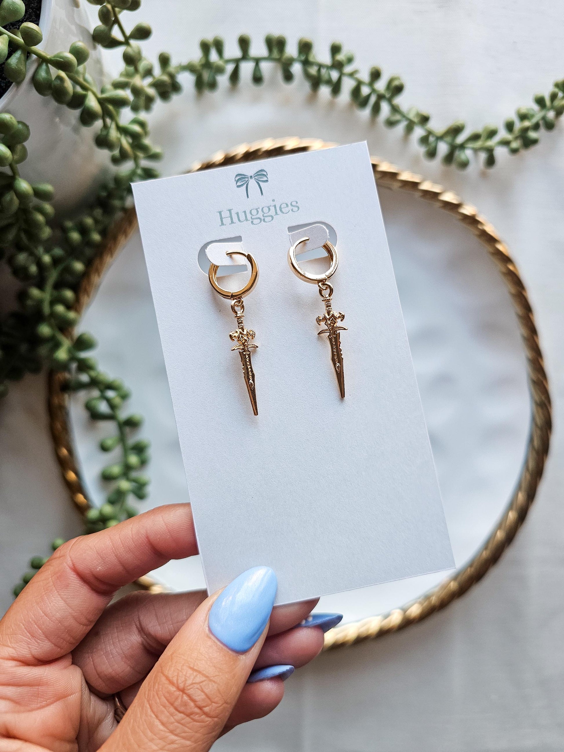 This design uses gold plated dagger charms. The huggie hoops are anti-tarnish, hypoallergenic, and gold plated.