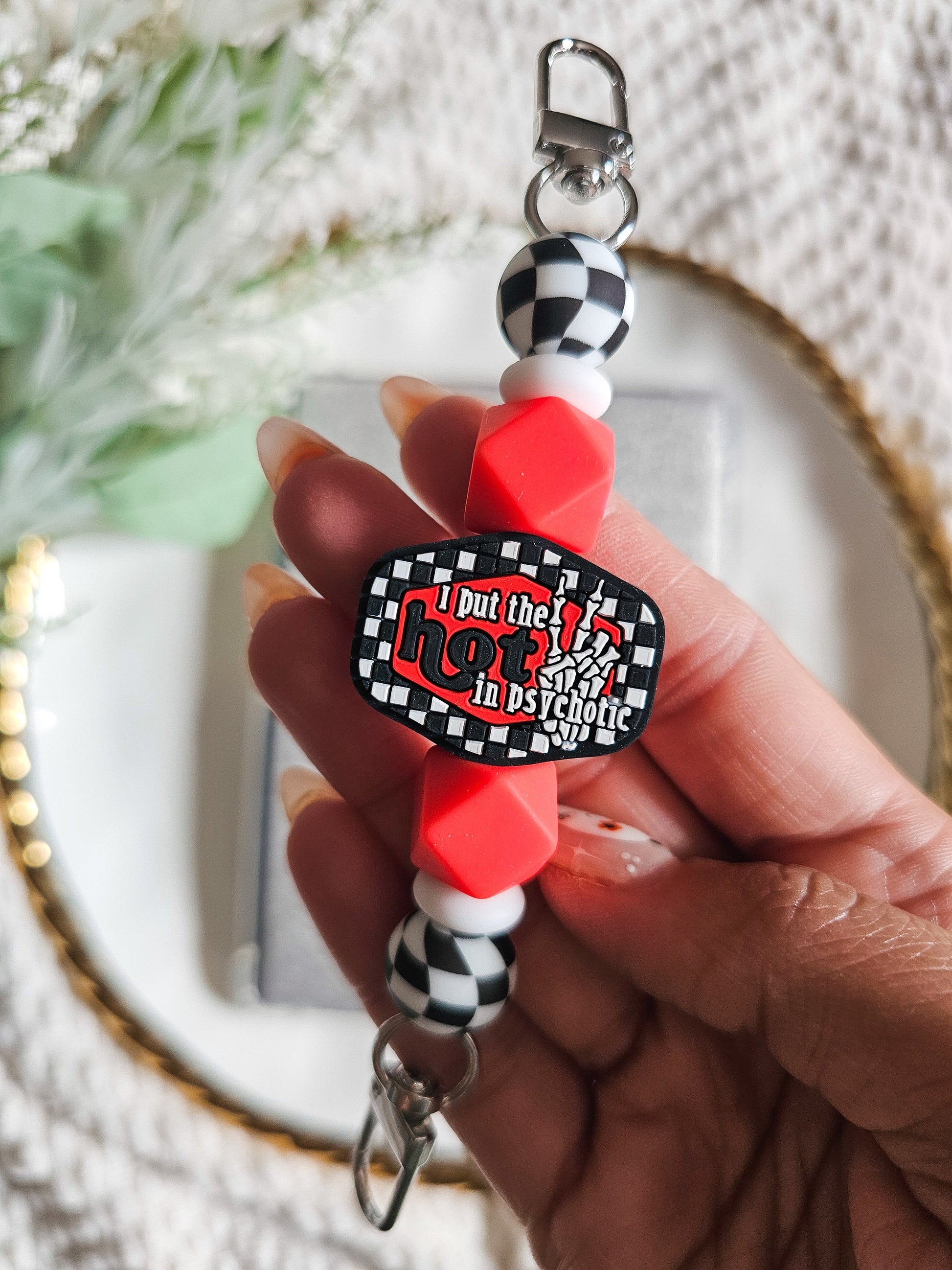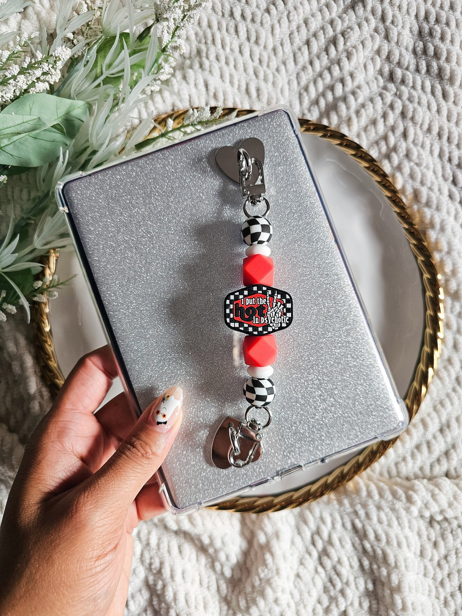For the readers who like their books dark, dramatic, and a little unhinged, this interchangeable Kindle strap is made to stand out. With bold black-and-white checkered accents, vibrant red beads, and the statement phrase “I put the hot in psychotic,” it channels emo Y2K nostalgia with a modern, elevated twist.