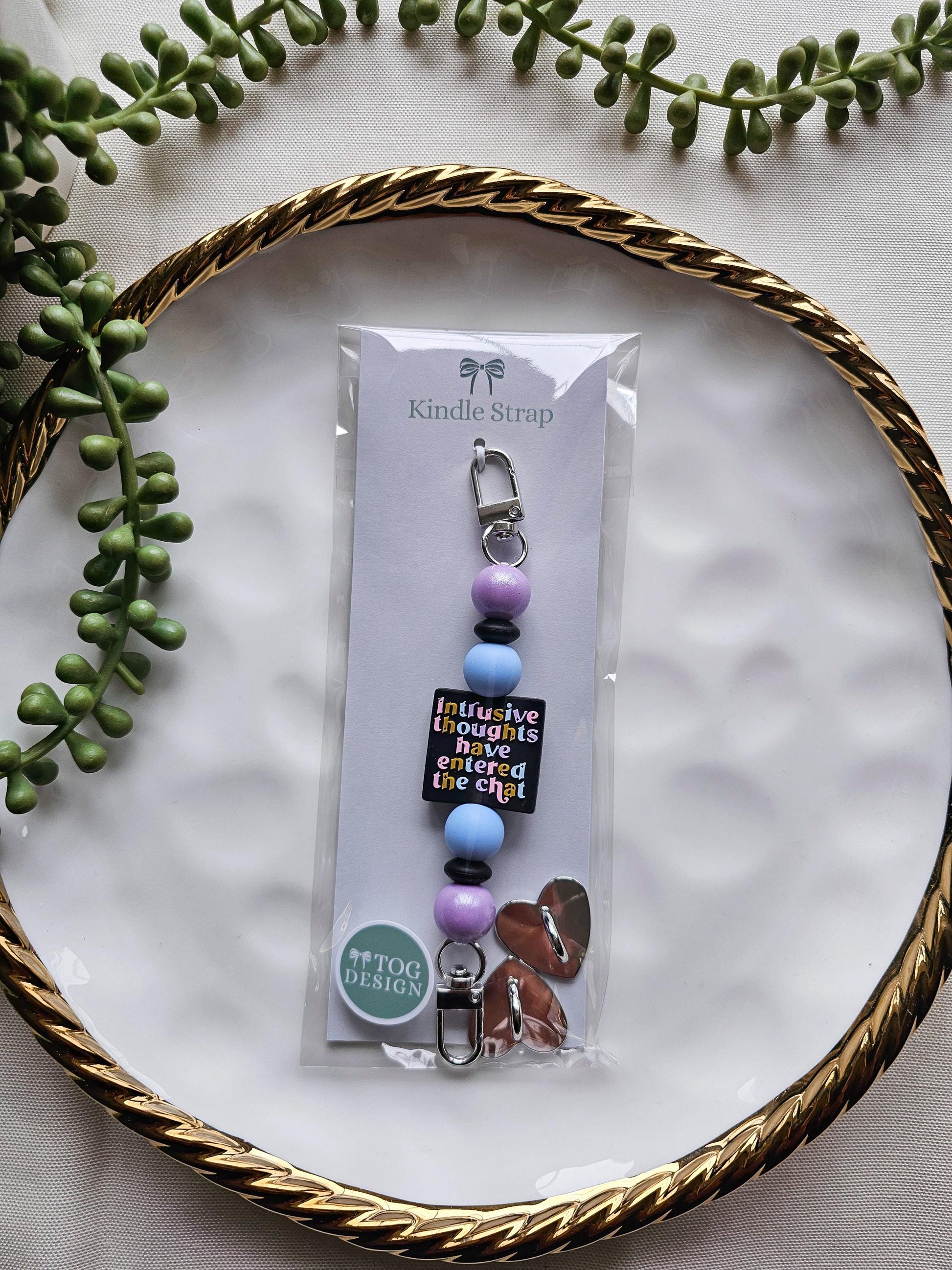 For readers whose minds never quite stay quiet, this interchangeable Kindle strap features a playful "Intrusive thoughts have entered the chat" focal bead paired with soft purple and icy blue beads. Equal parts funny and functional, this strap is perfect for readers who appreciate humor, personality-driven accessories, and a little self-awareness during their reading sessions.