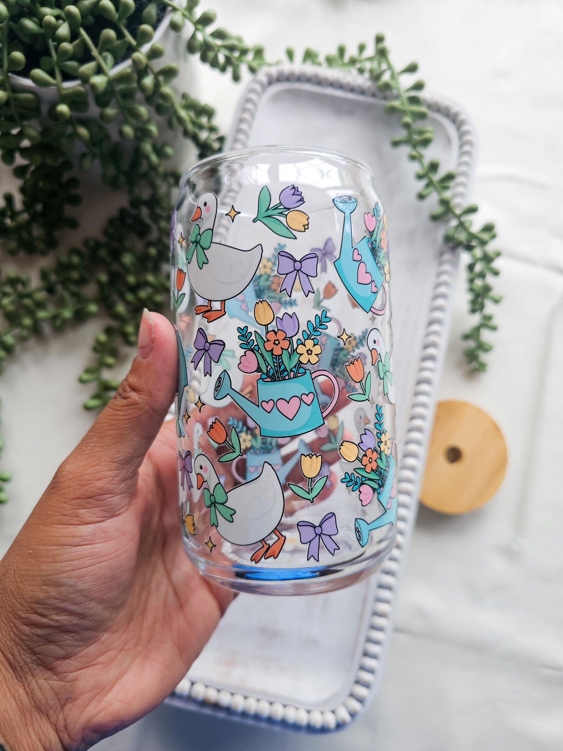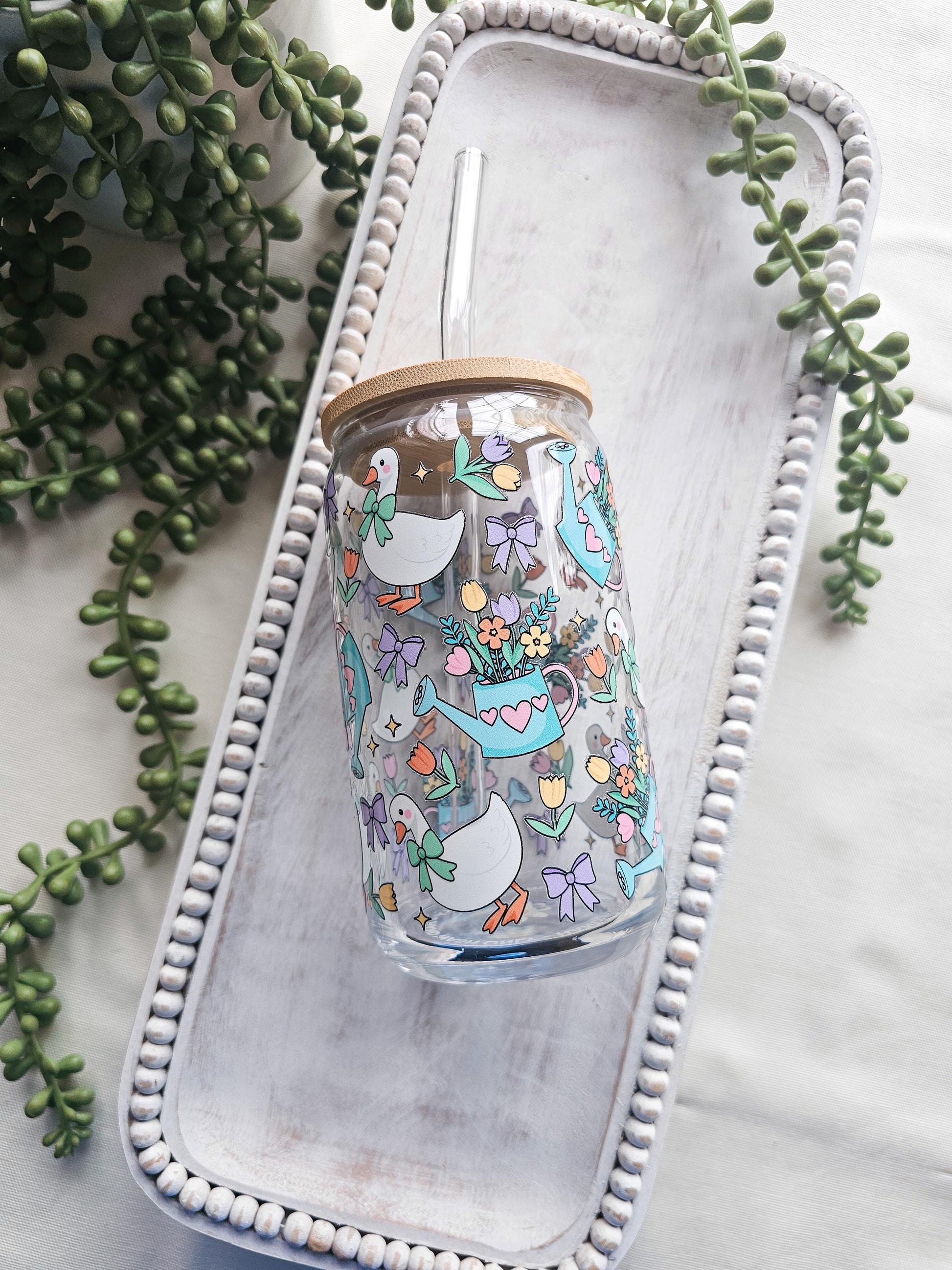 This 16 Fl oz cup features a charming ducky design. Every purchase includes the cup itself, a glass straw, and a bamboo lid.