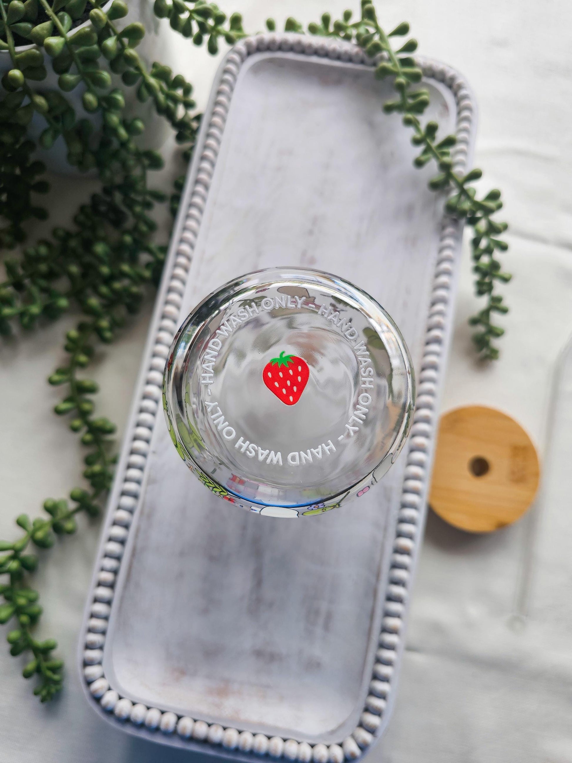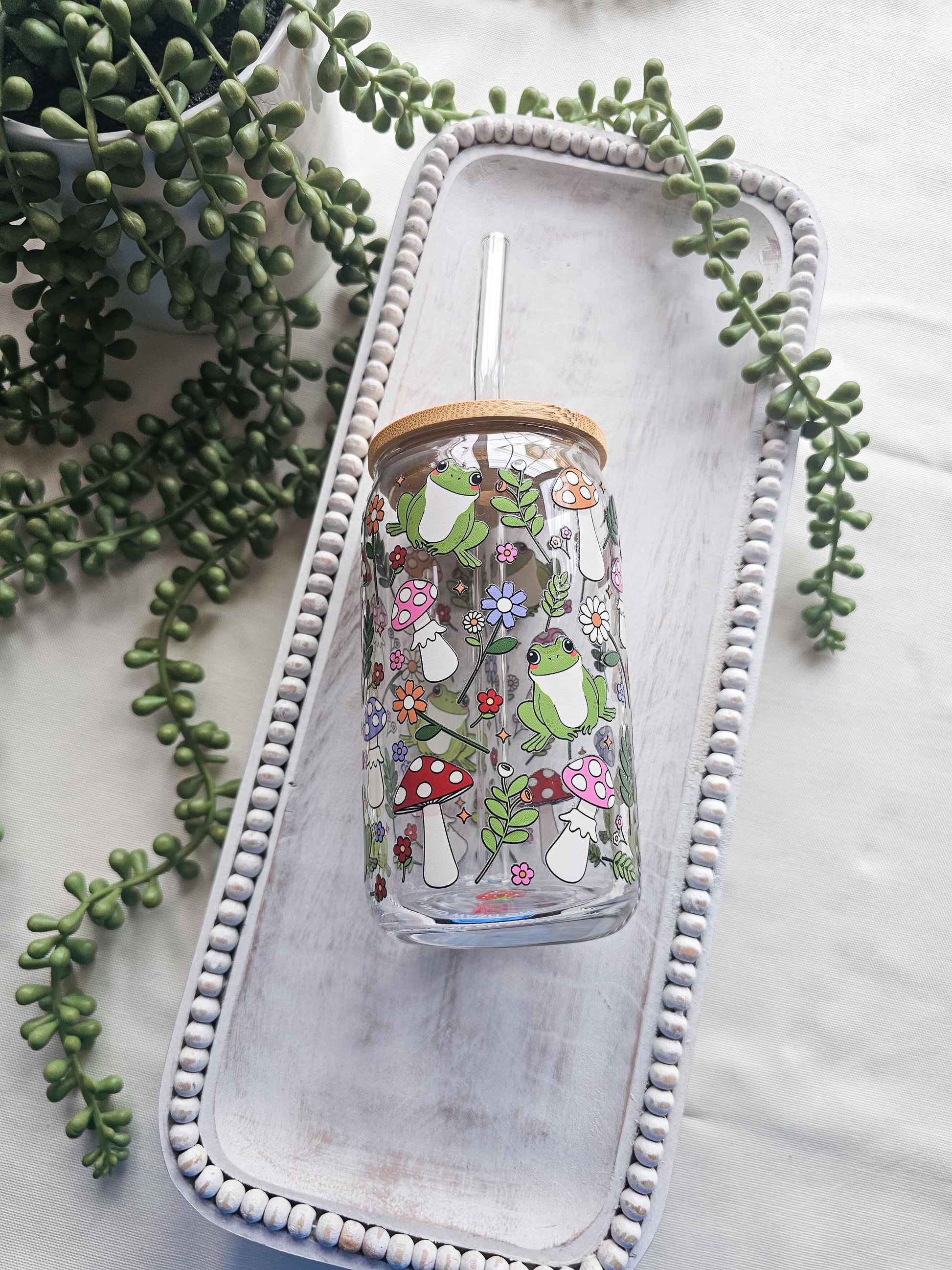 This 16 Fl oz cup features a charming mushroom and froggy design. Every purchase includes the cup itself, a glass straw, and a bamboo lid.
