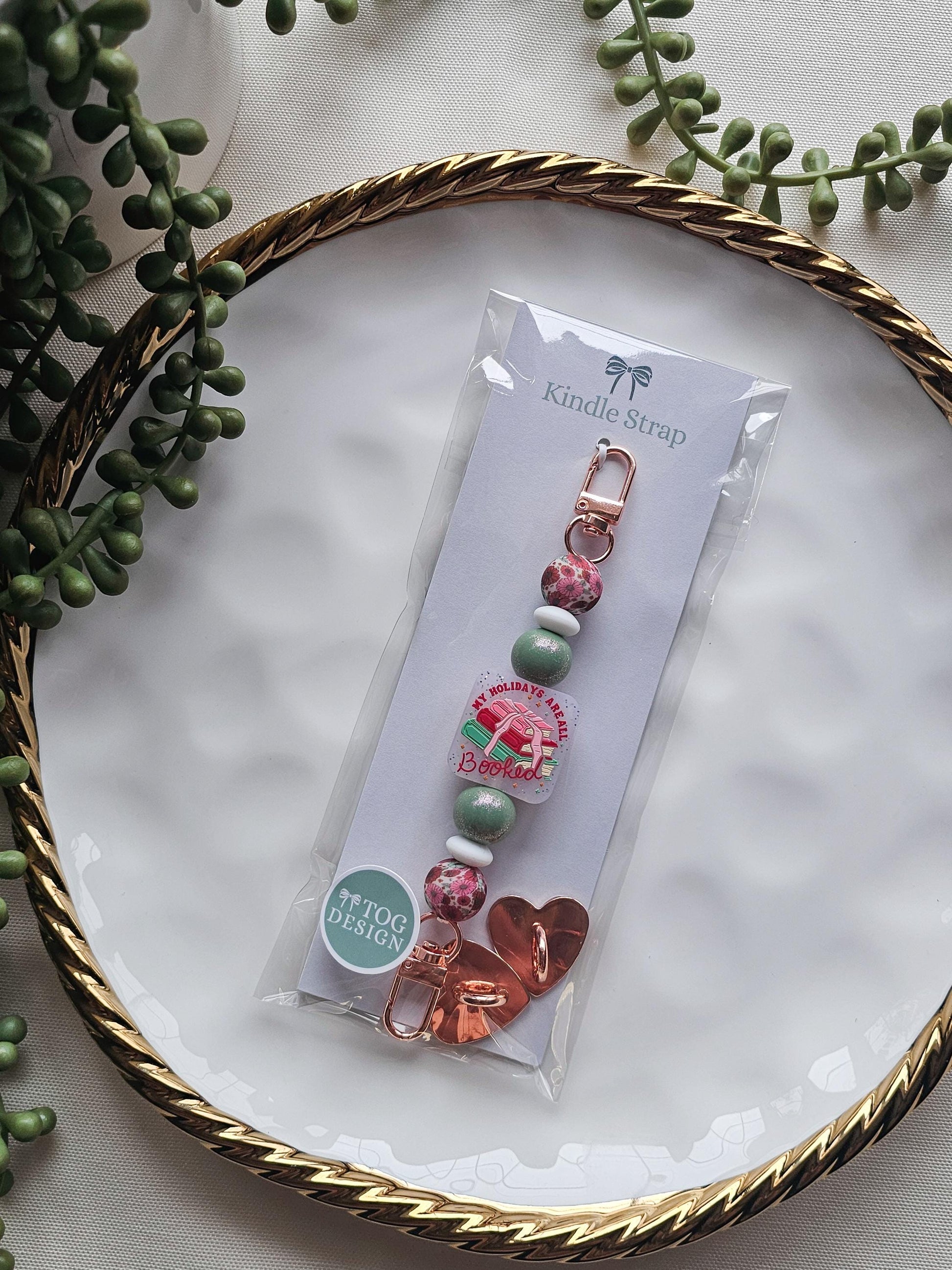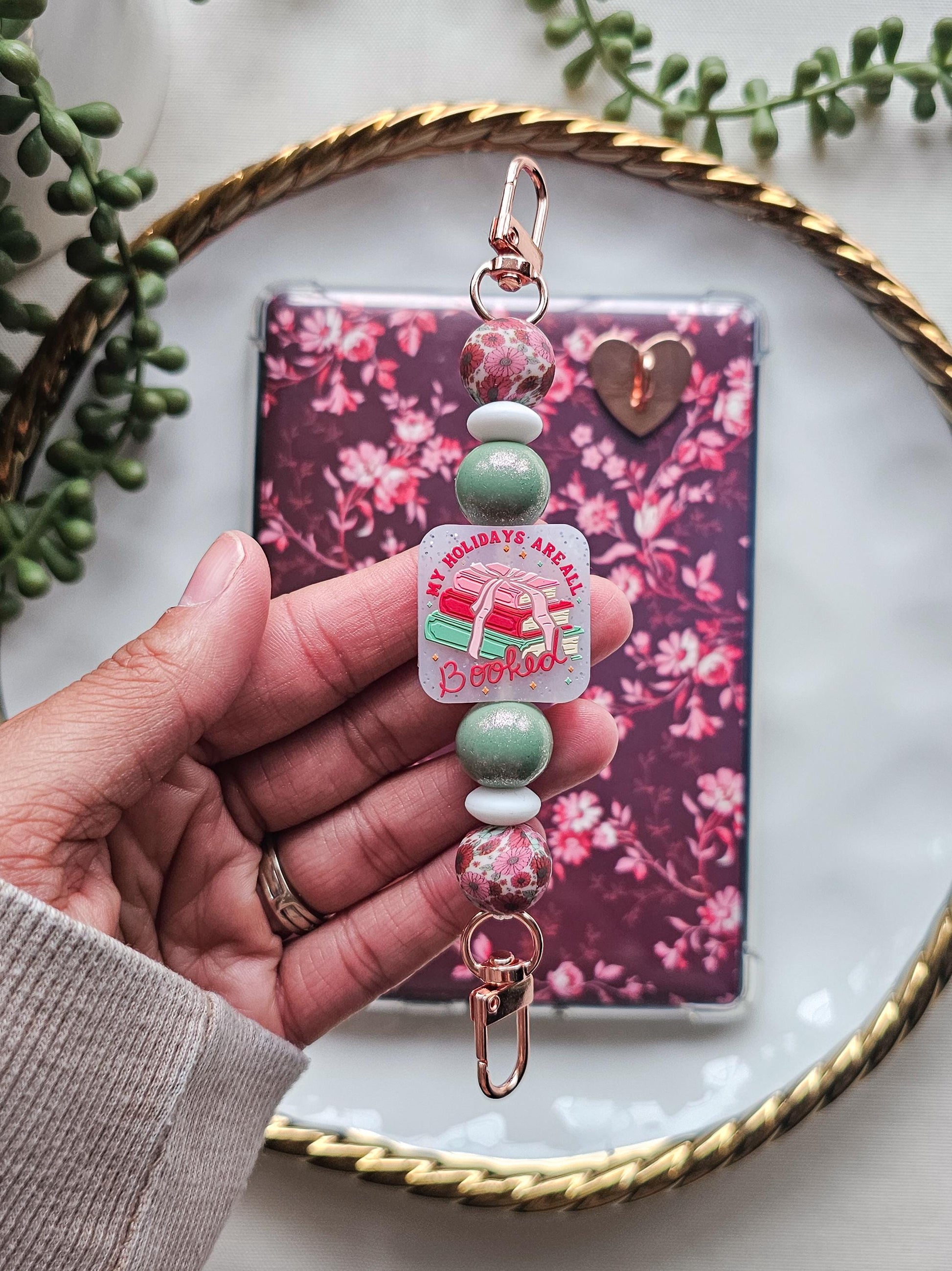 Featuring a charming book stack focal bead tied with a bow and paired with glittery sage green beads and soft holiday florals, this strap is perfect for readers who celebrate the season with stories, comfort, and a little extra magic.