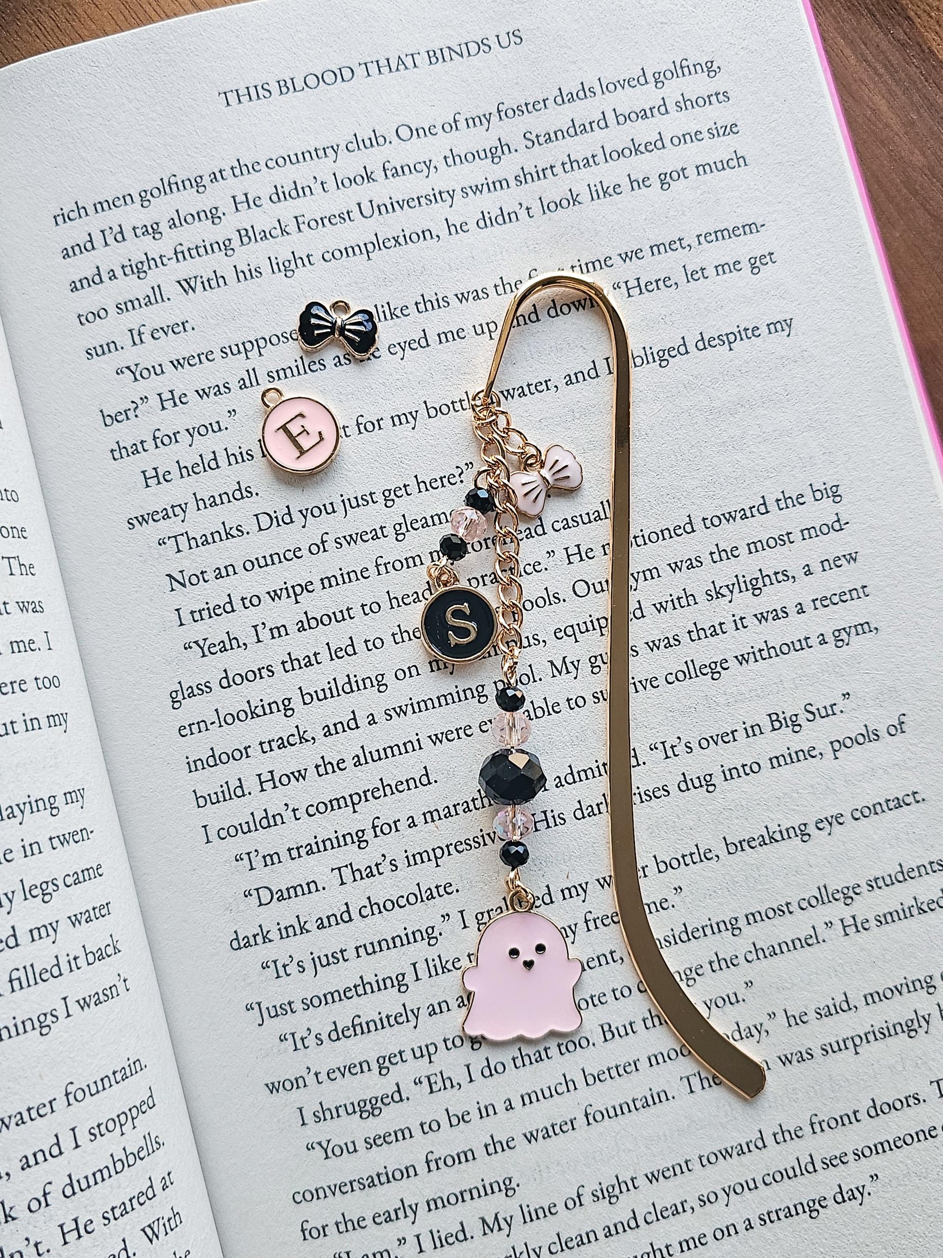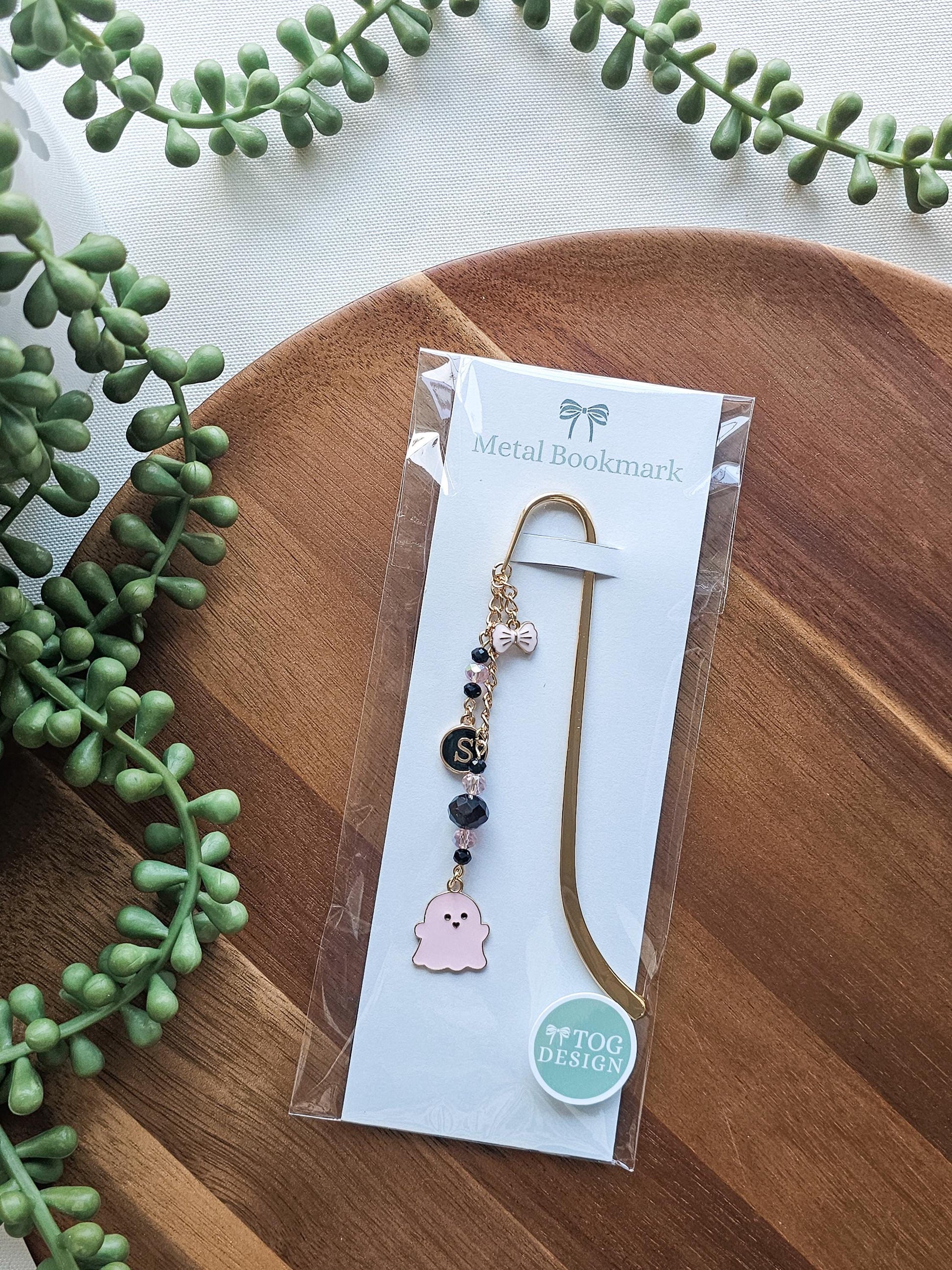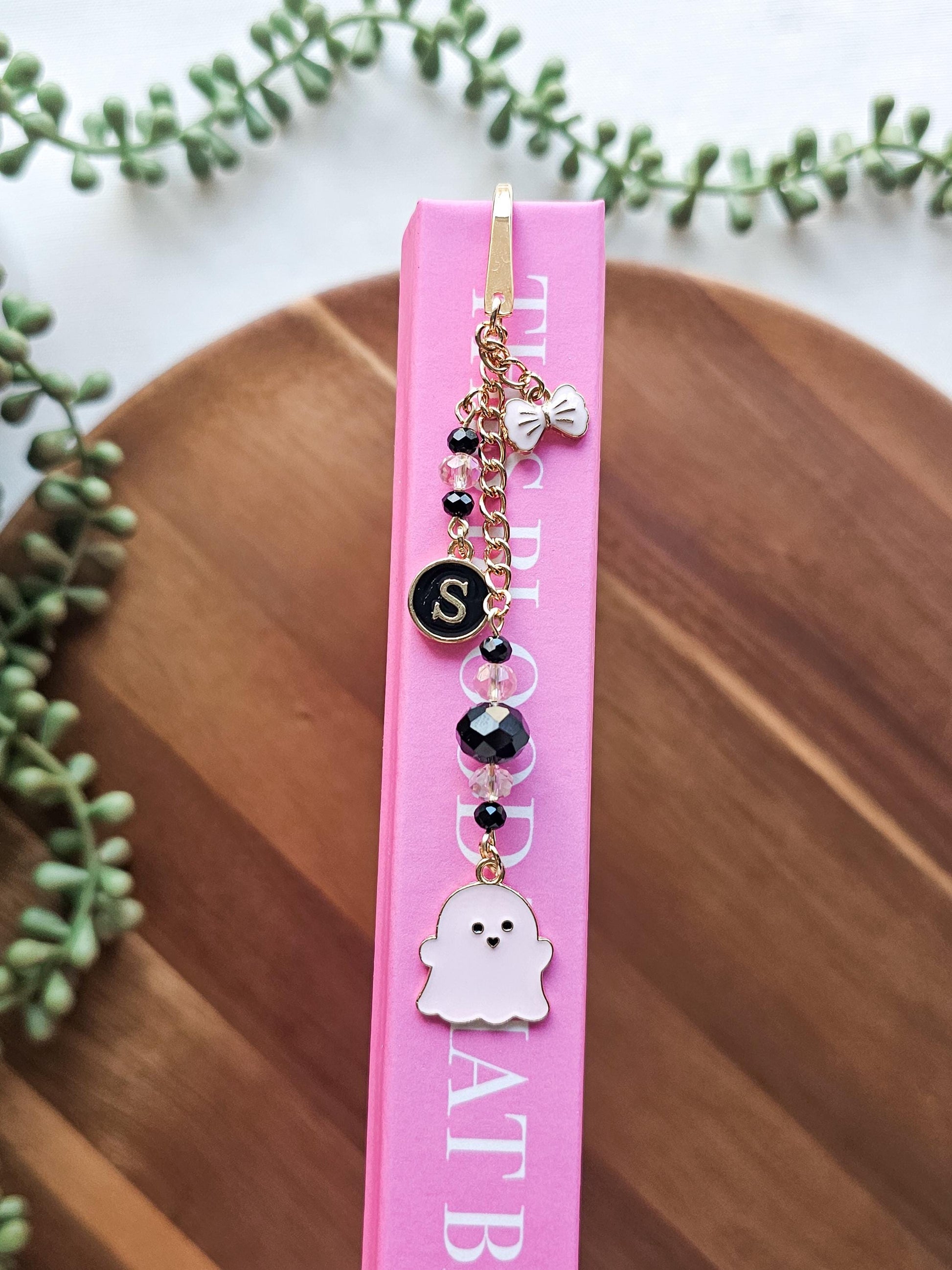 Featuring a playful ghost charm, sparkling crystal beads, a personalized initial, and a delicate bow accent, this piece is meant to feel like adornment — not just a placeholder. Each element is thoughtfully arranged to catch the light and add personality between the pages, making it just as beautiful displayed on a bookshelf as it is tucked inside a book.