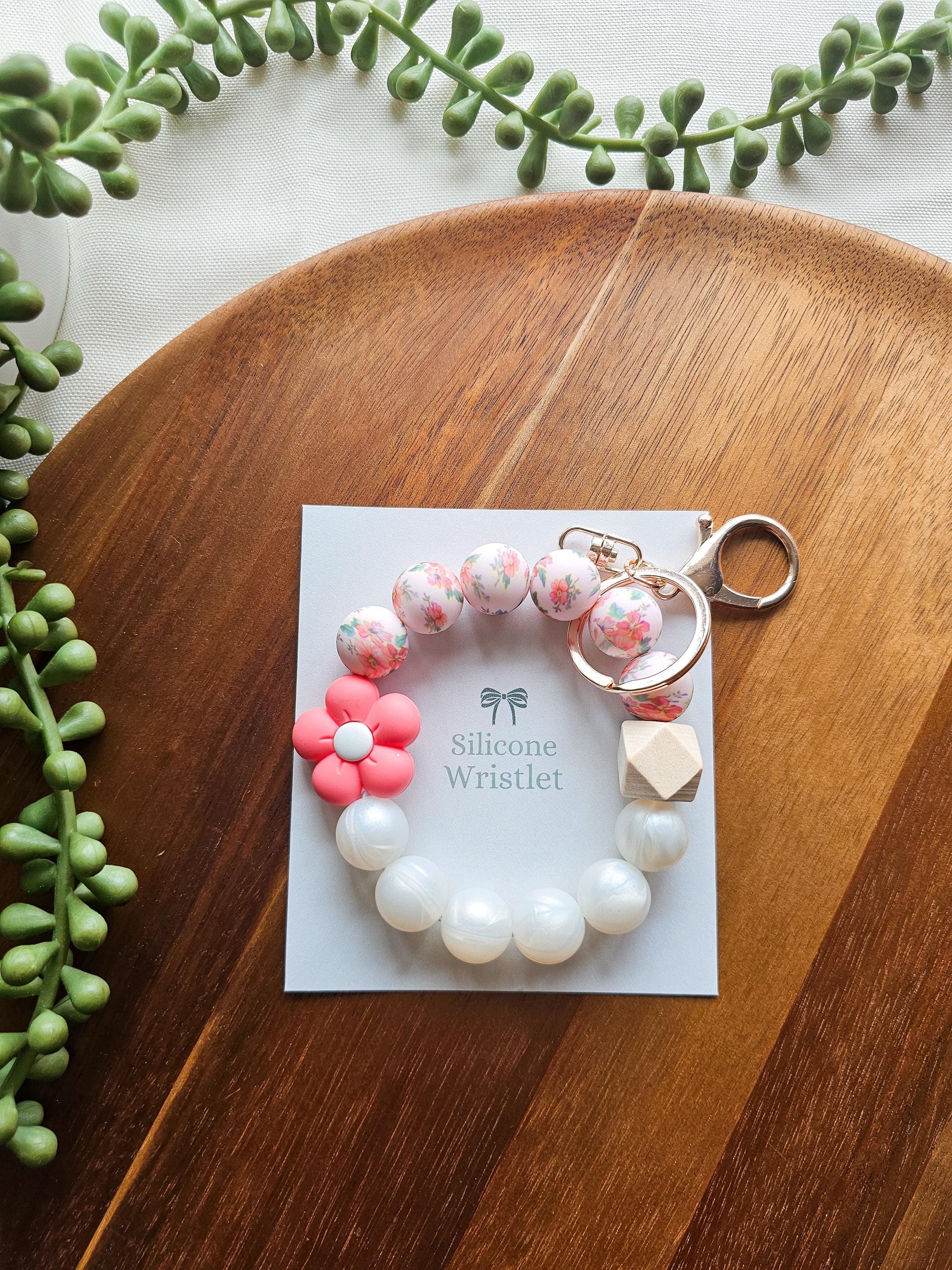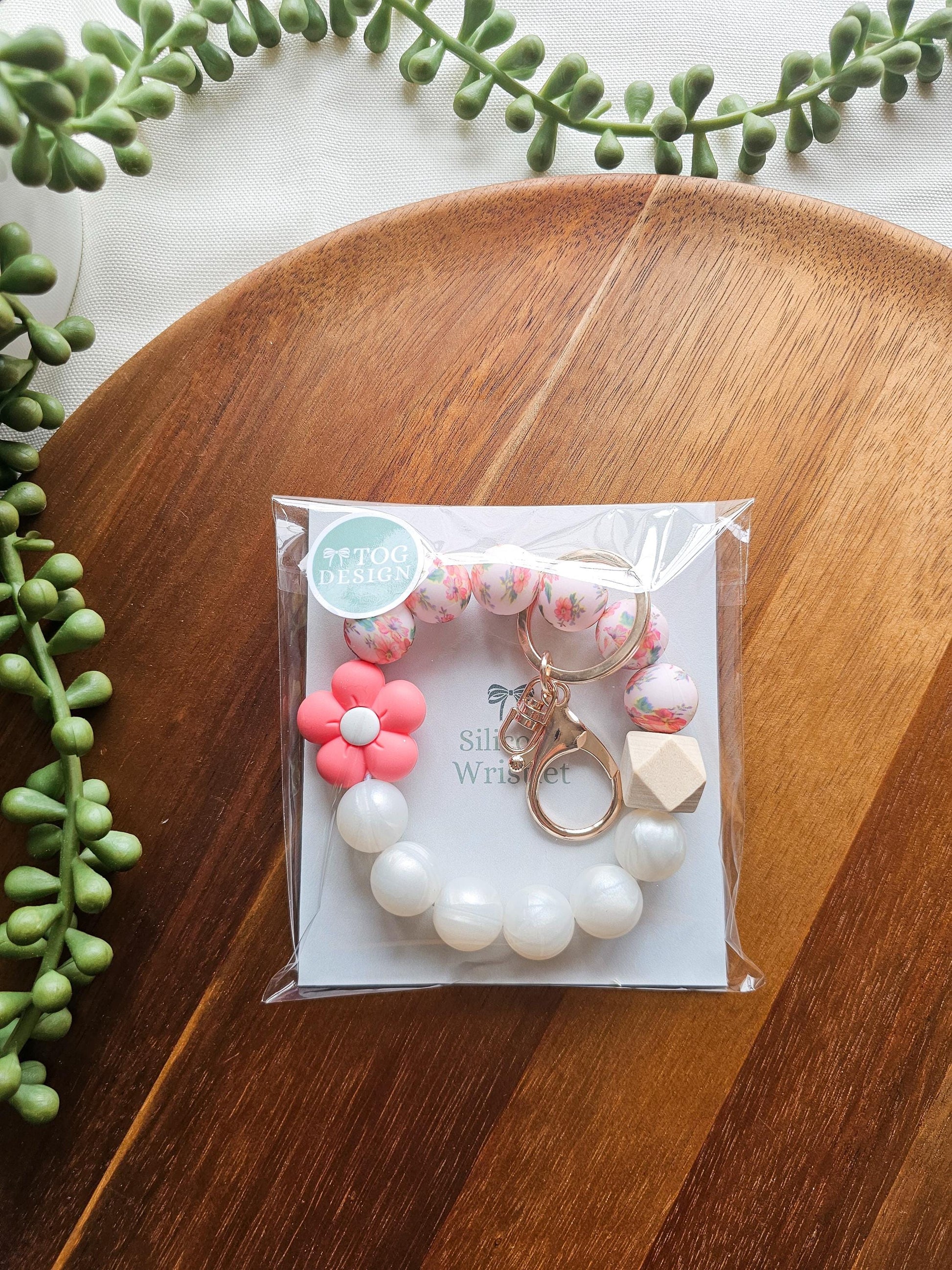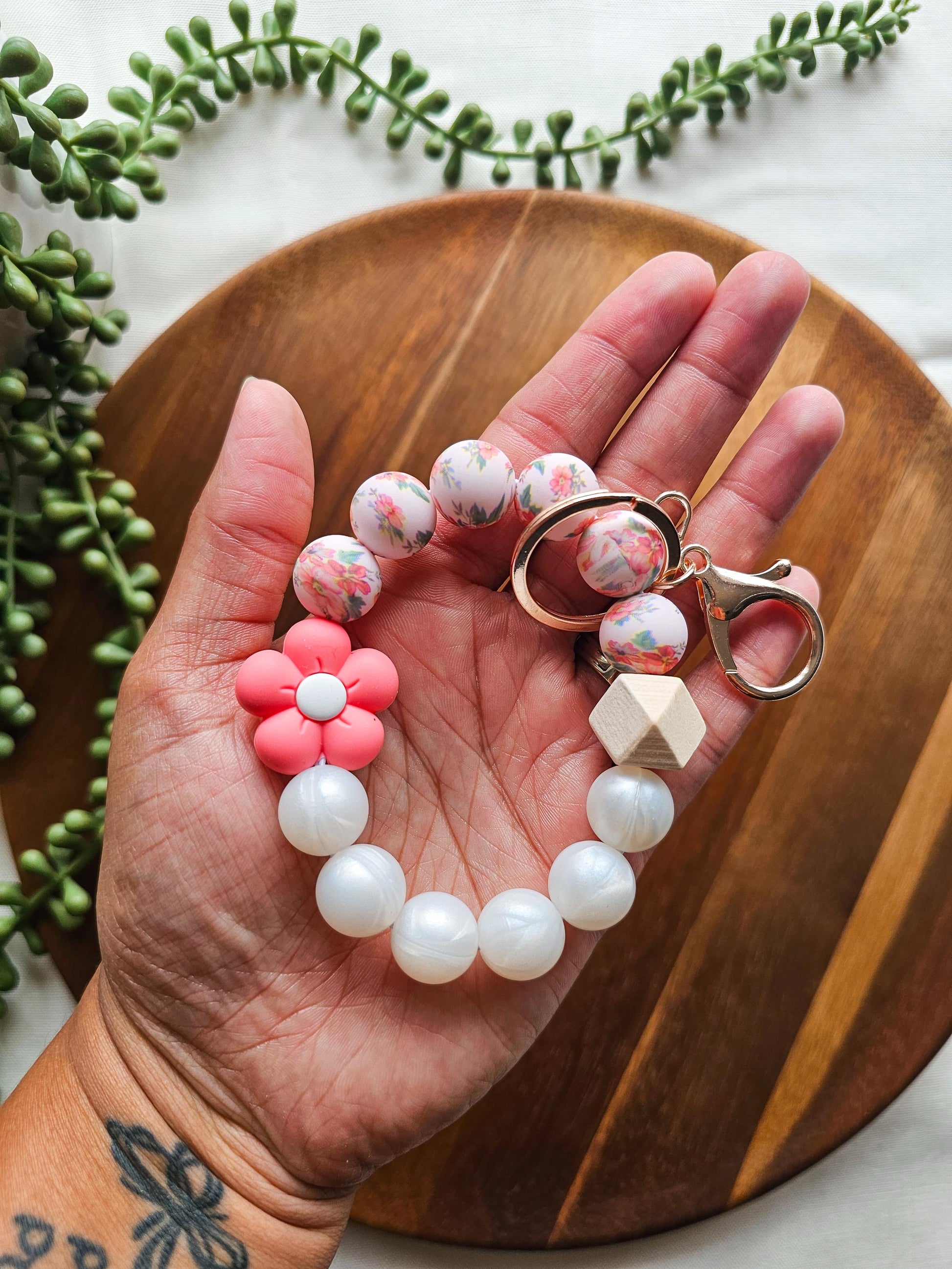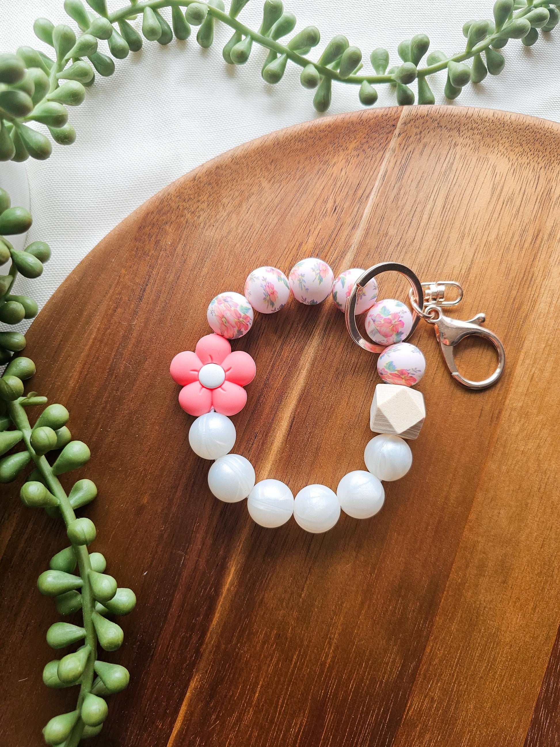 A soft and pretty keychain wristlet made with a pink flower focal bead, silicone beads and a wooden bead. The perfect gift that‘s not only functional, but stylish too!