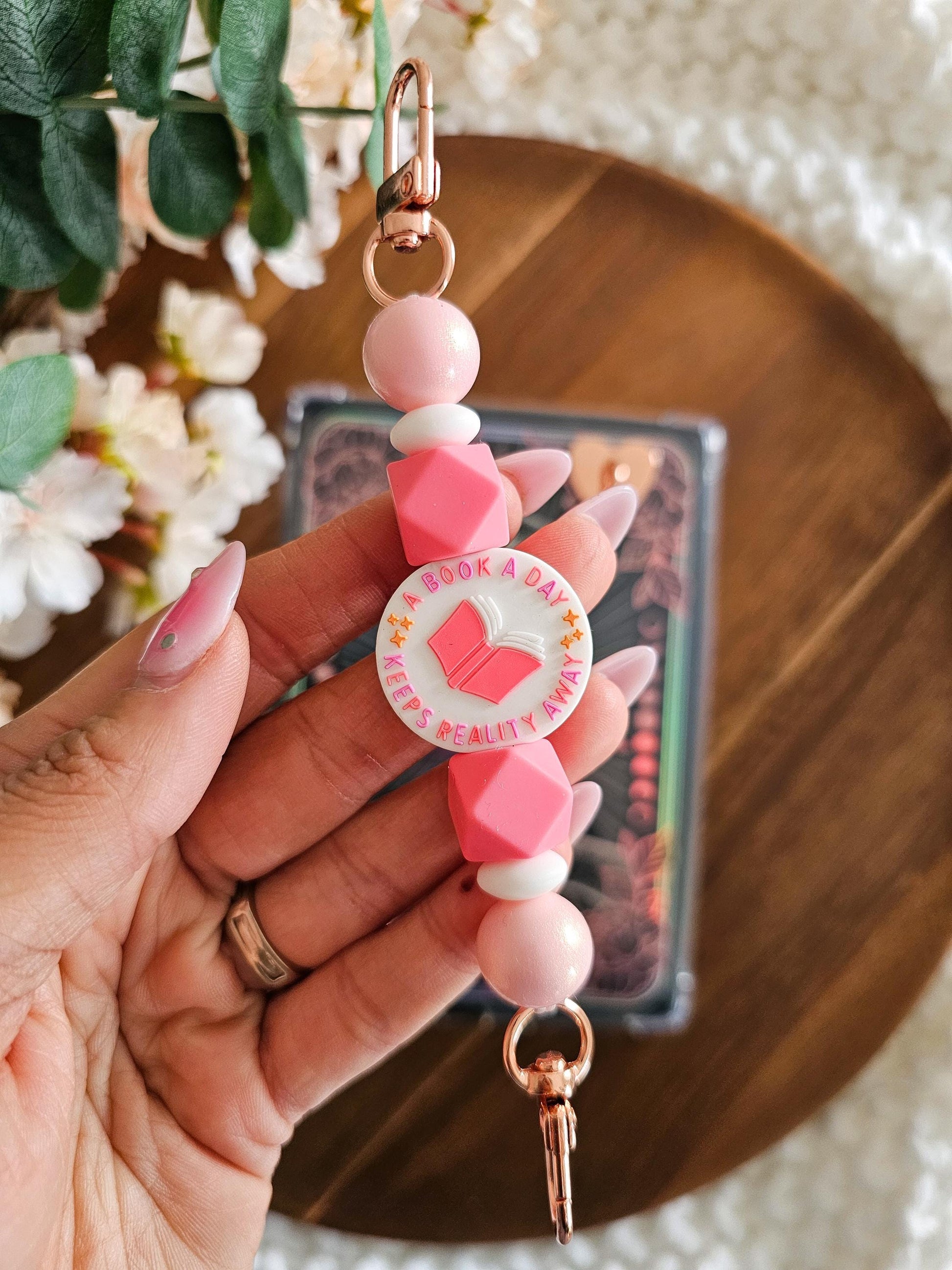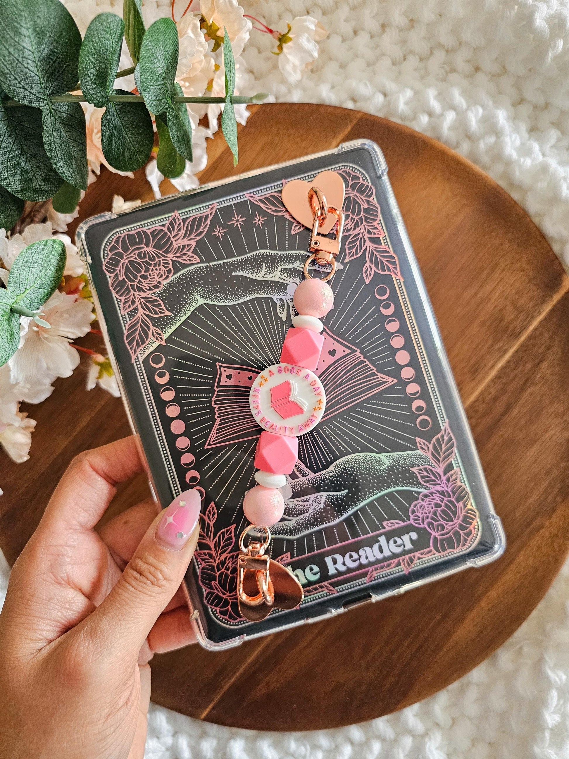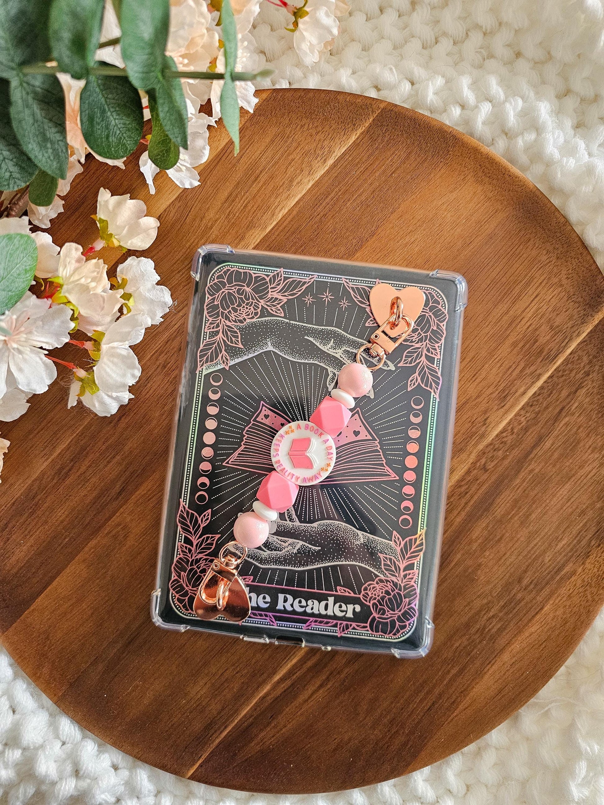 A gentle reminder that books are sometimes the best medicine. The Reality, Booked Kindle Strap is made for readers who slip away into stories one page at a time. Featuring a sweet open-book focal bead and soft coral-pink and petal-pink beads, this strap feels romantic, calming, and effortlessly cozy — perfect for slow reading days, pink lovers, and anyone who finds comfort in fictional worlds.