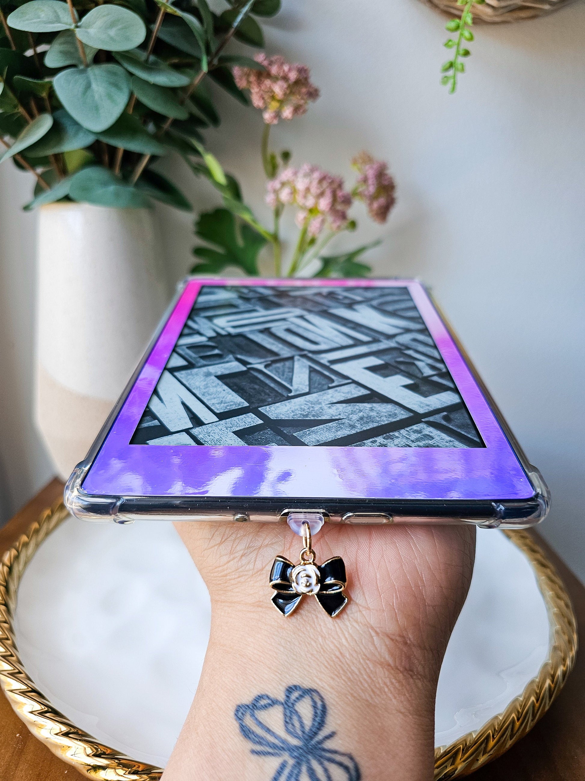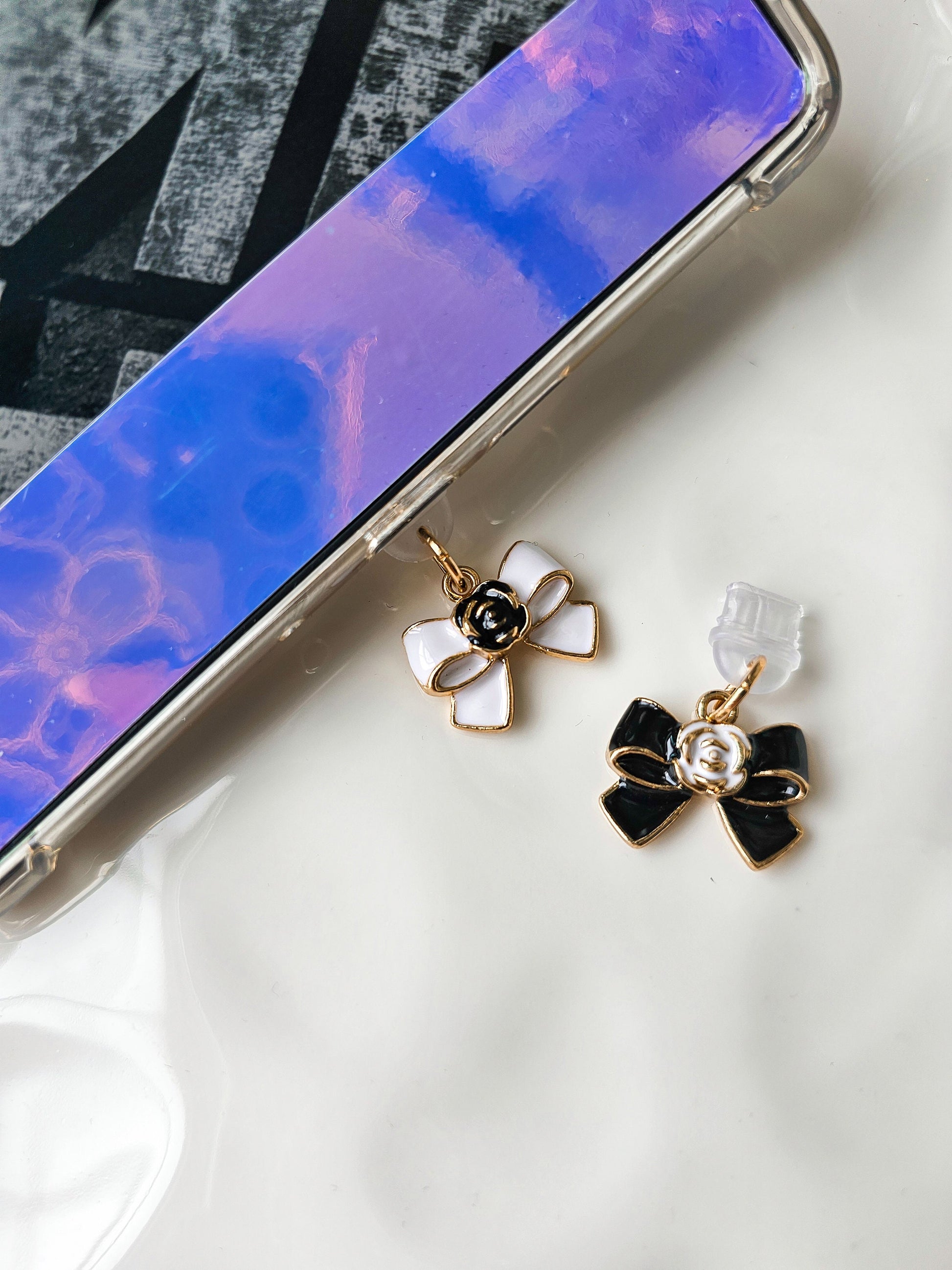 Add a soft, romantic touch to your everyday tech with this rosette bow charm for your phone or Kindle. Available in white or black, this delicate dust plug charm is perfect for lovers of minimalist coquette style, cozy aesthetics, and timeless feminine details!