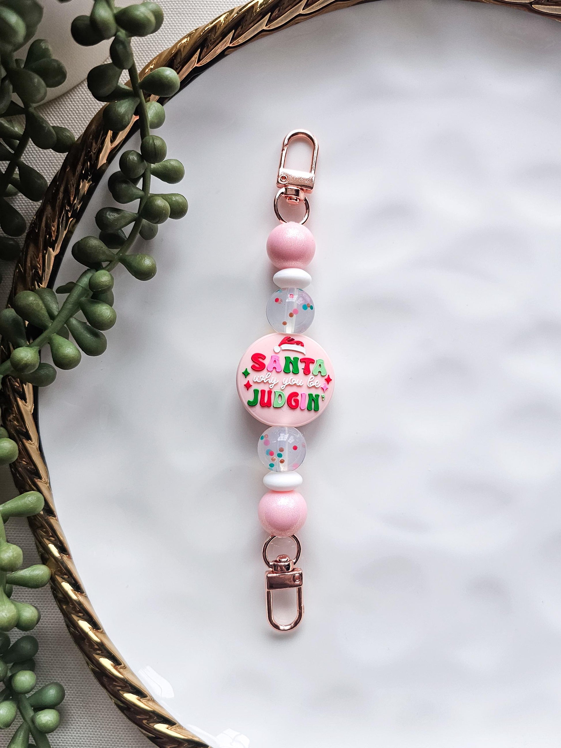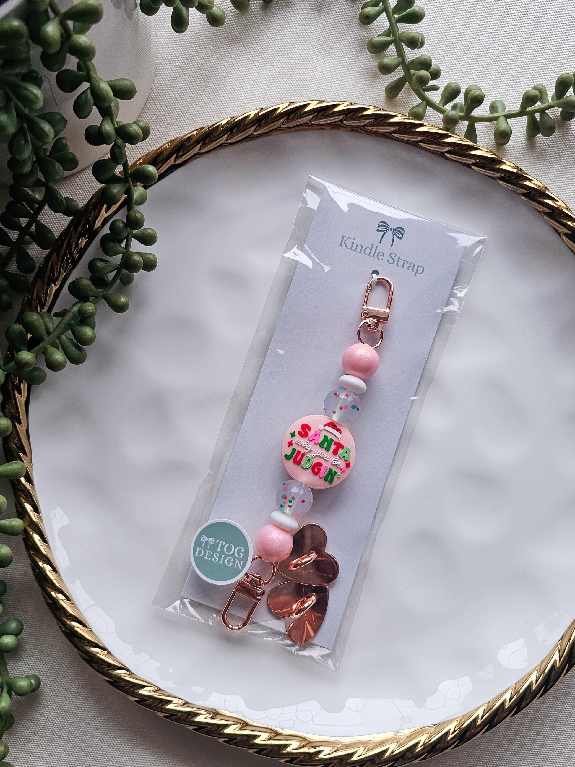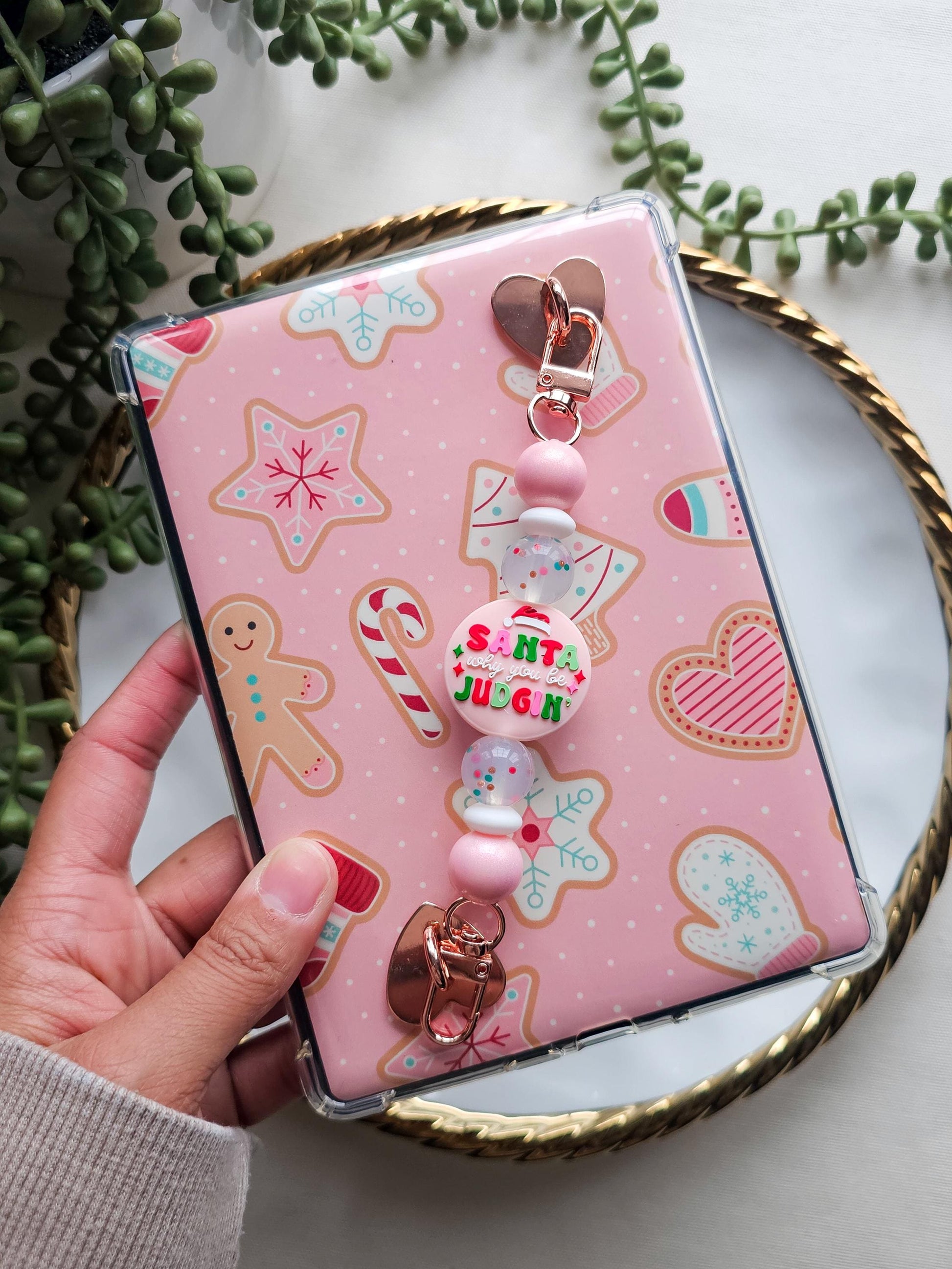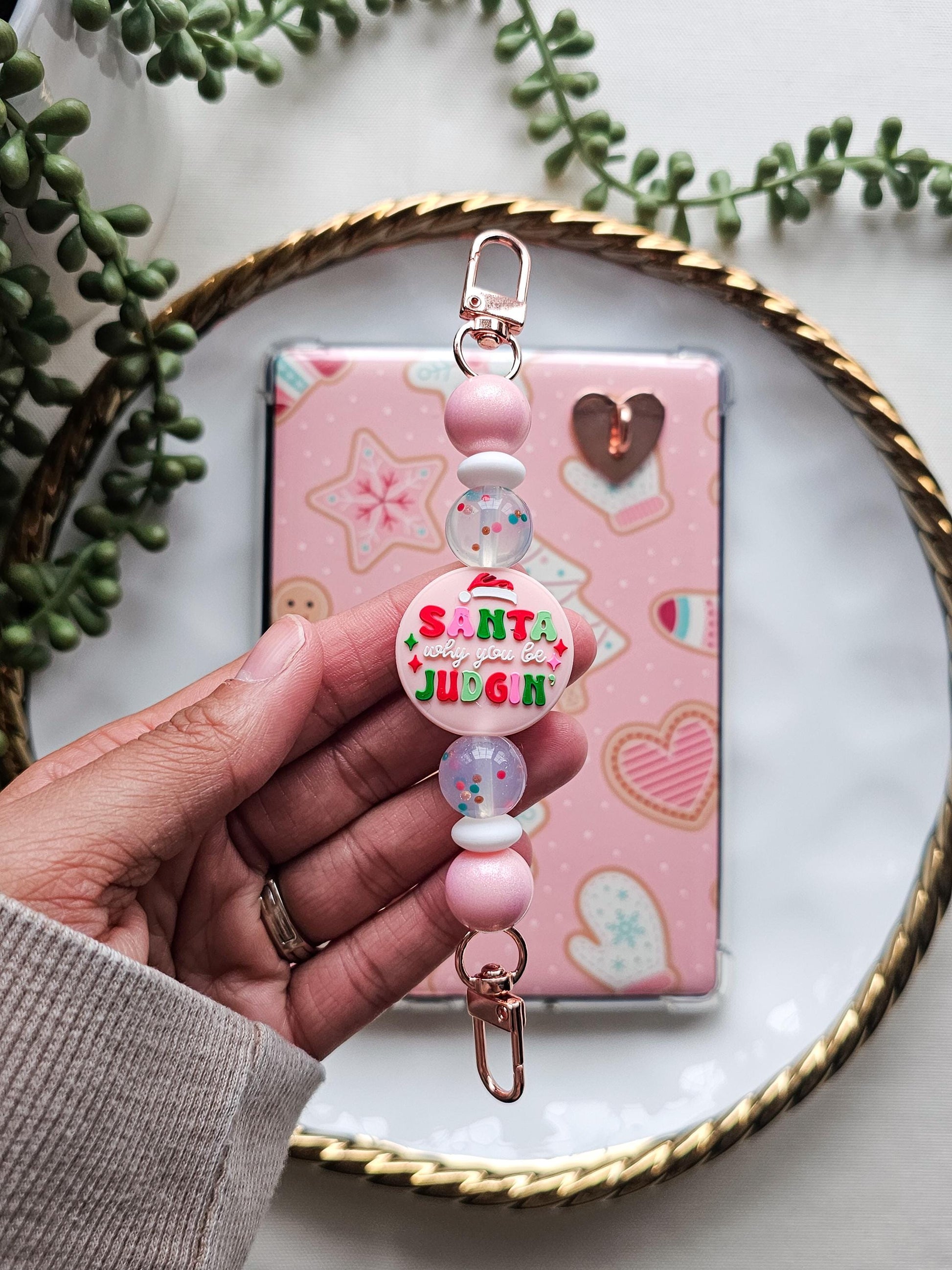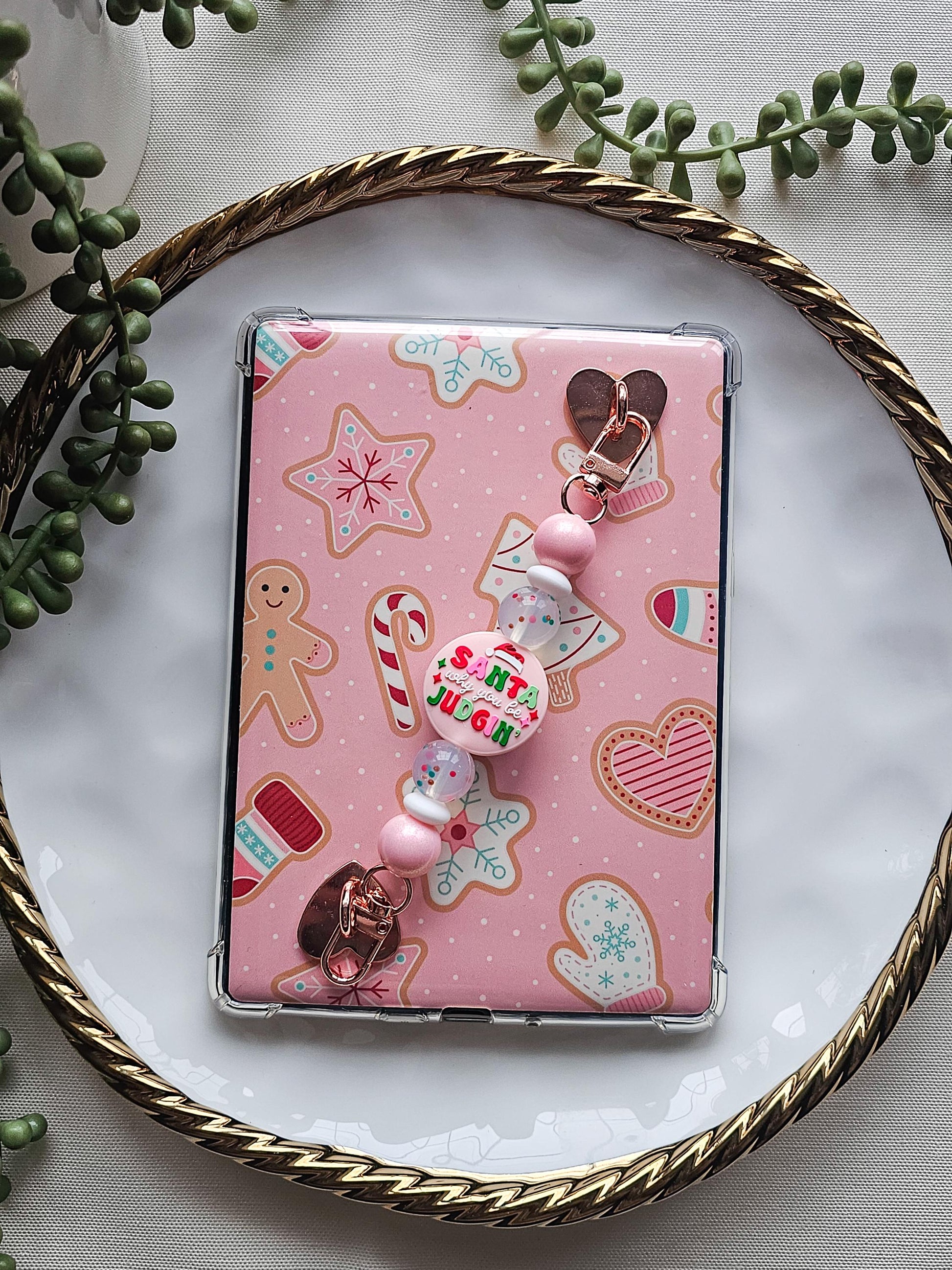Playful, cheeky, and full of holiday humor, this "Santa why you be judgin" Kindle strap is a festive favorite for readers who love a little sass with their seasonal reads. Featuring a humorous focal bead with pink shimmer beads and playful holiday confetti beads, this strap adds a cozy pop of personality to your Kindle during the most wonderful (and judgmental ) time of the year.