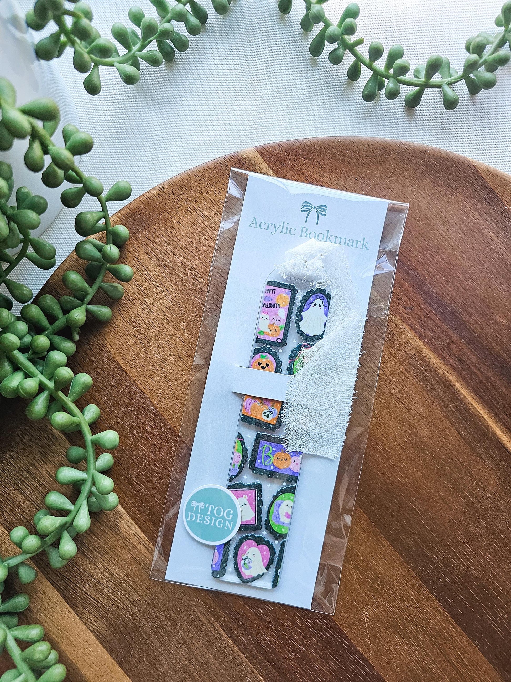 This particular bookmark features an adorable spooky themed decal and a matching ghostly white chiffon ribbon tassel.