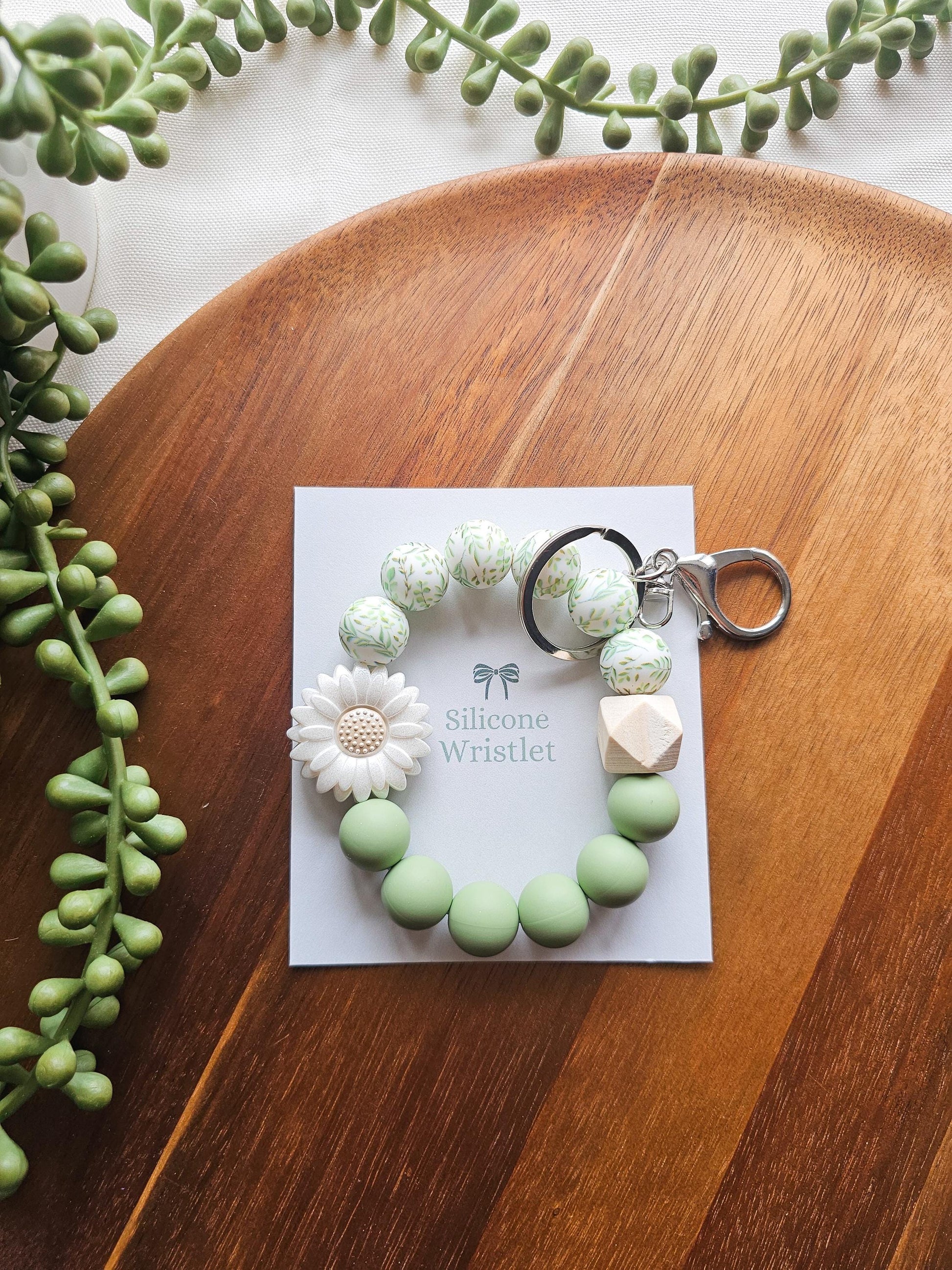 A soft and pretty keychain wristlet featuring a white daisy focal bead and a wooden bead. The perfect gift that‘s not only functional, but stylish too!