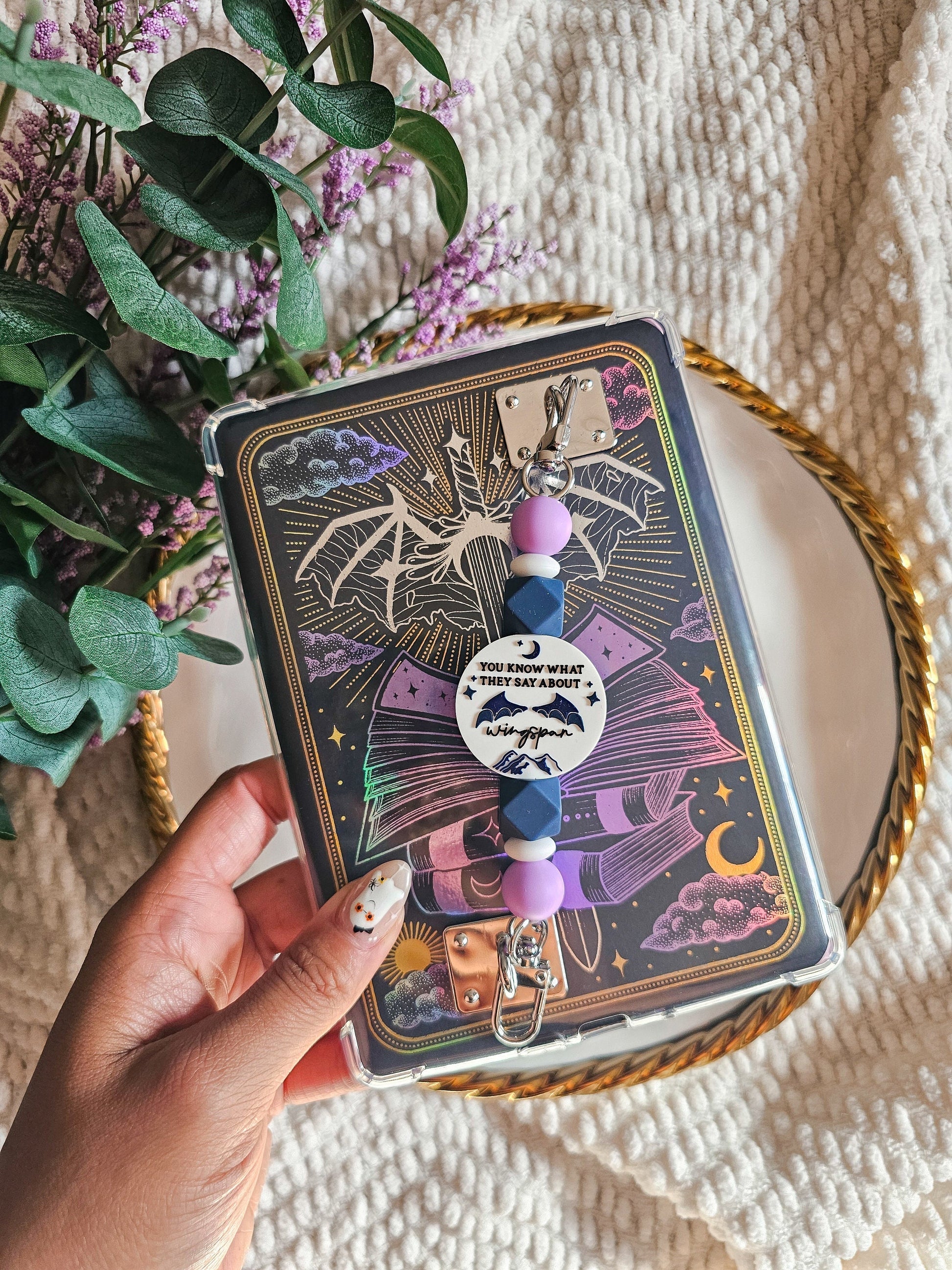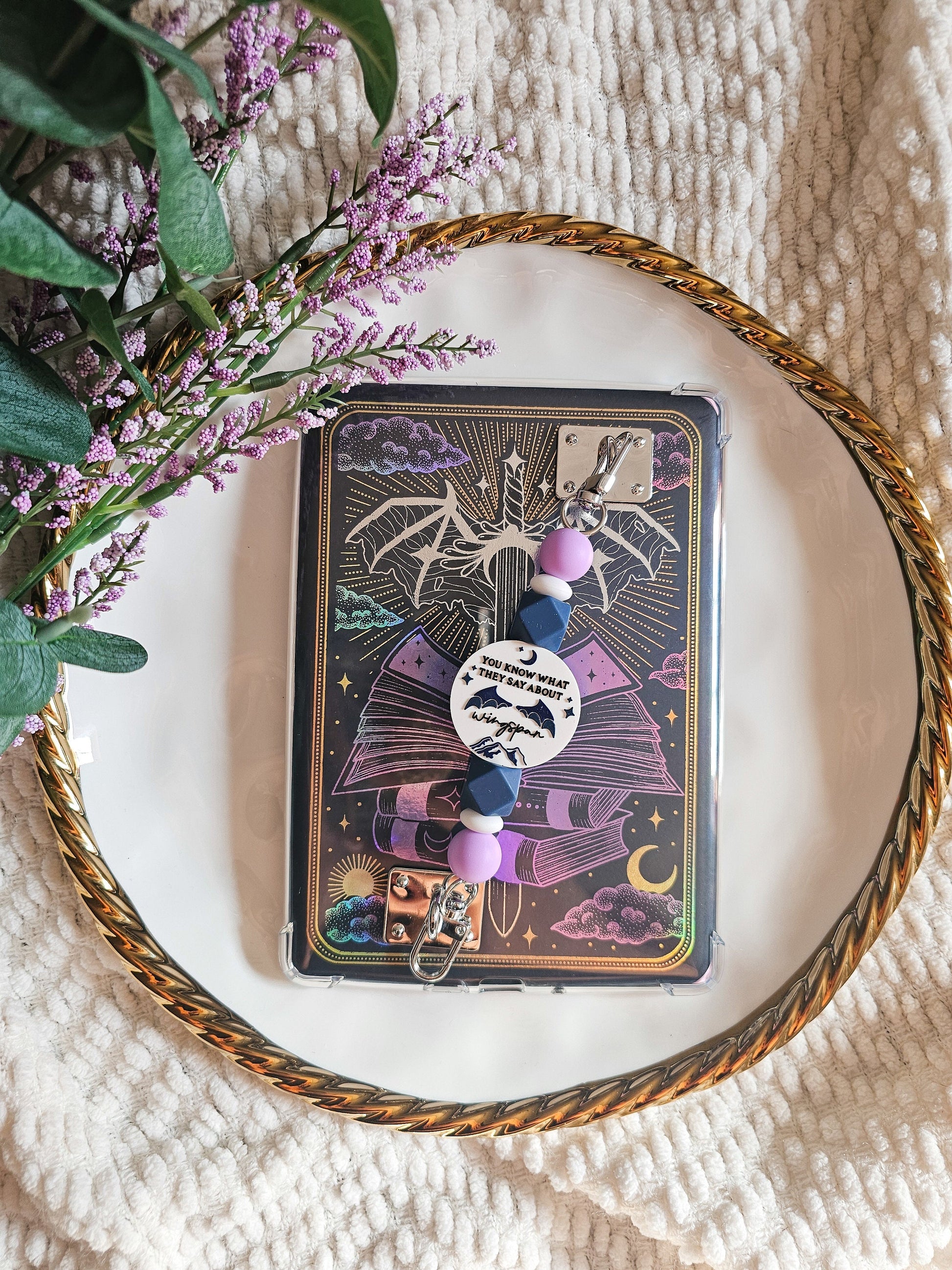 Designed for romantasy readers who know exactly what they say about wingspan, this interchangeable Kindle strap is inspired by starlit skies, powerful wings, and unforgettable love stories. Featuring the phrase "you know what they say about wingspan" and paired with midnight blue and soft purple tones, it brings subtle Velaris energy to your reading routine.