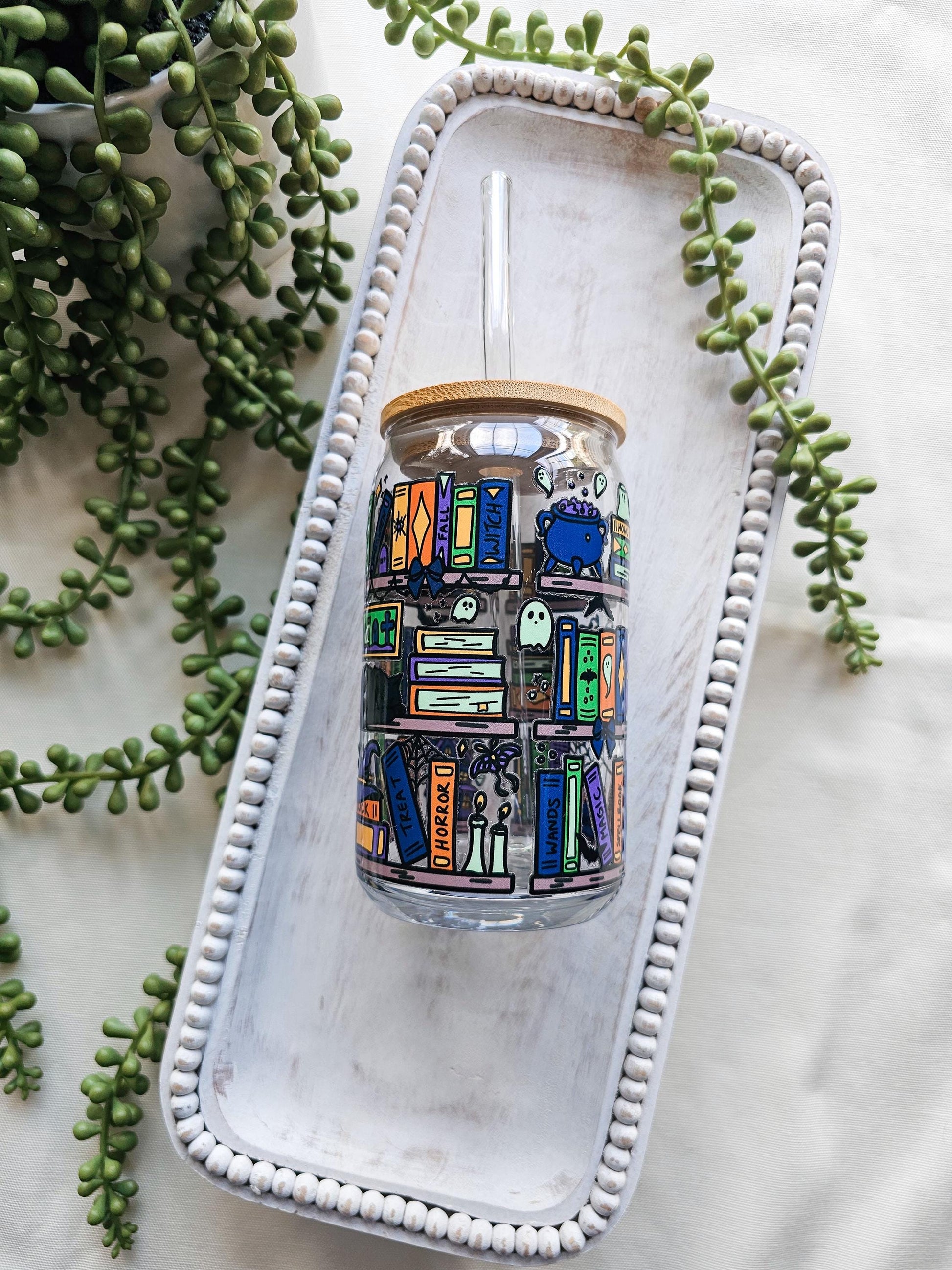 This particular cup is 16 fl oz and has a spooky witchy library decal. Each order includes the coffee cup, a glass straw, and a bamboo lid.
